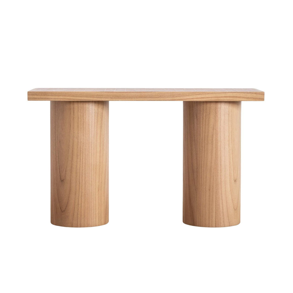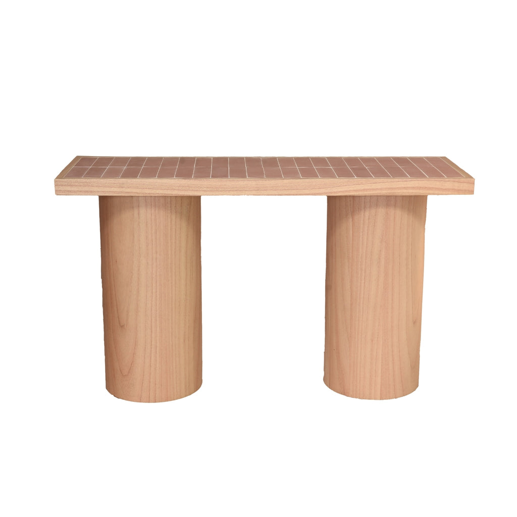 Its elongated top, adorned with terracotta ceramic tiles, pairs beautifully with a round oak base, creating a striking interplay of clean lines and luxurious textures.