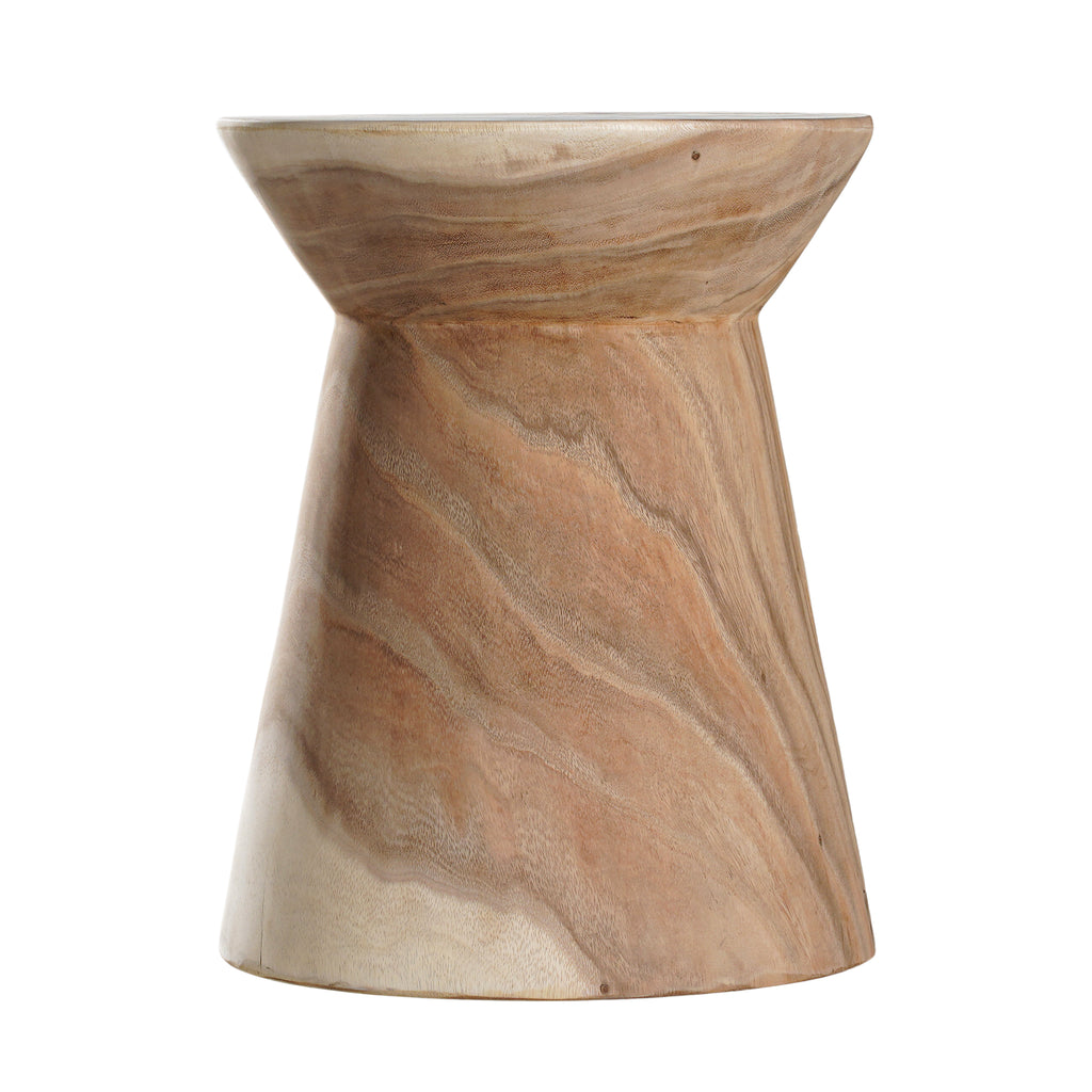 Reminiscent of exotic travels and inspired by nature, the Amakulu Side Table / Stool features traditional Indonesian engravings and soft earthy tones