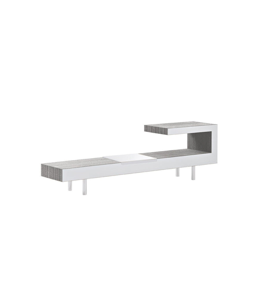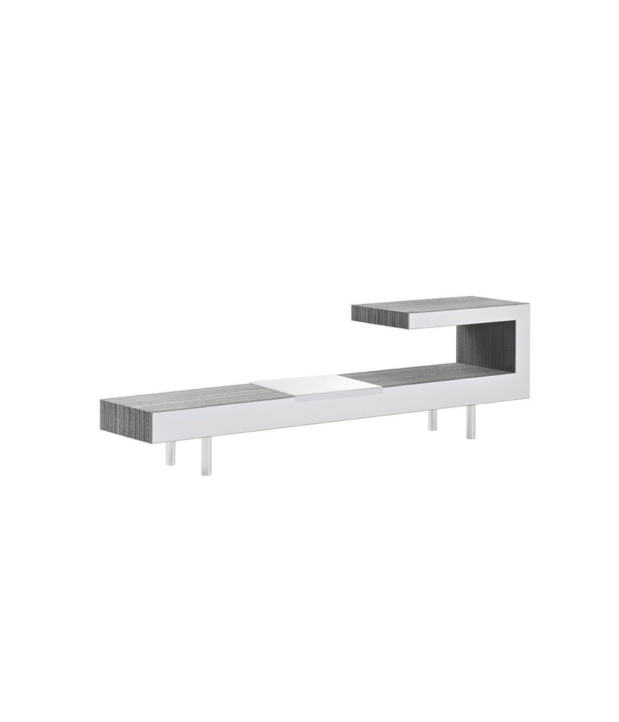 Made of double-corrugated kraft paper sheets available in many colors, Victor's front and back are covered with 4 mm / 0.16’’ thick lacquered MDF (medium density fiberboard), and the steel feet are powder-coated in matte white. The top support is in plexiglass.
