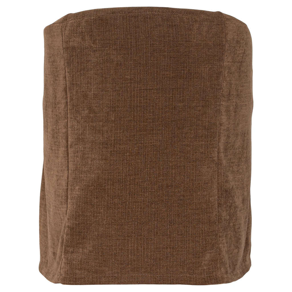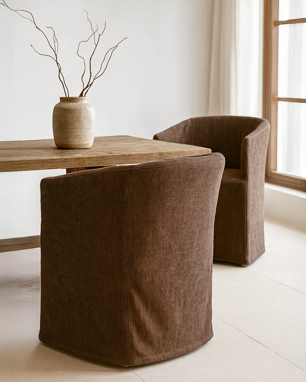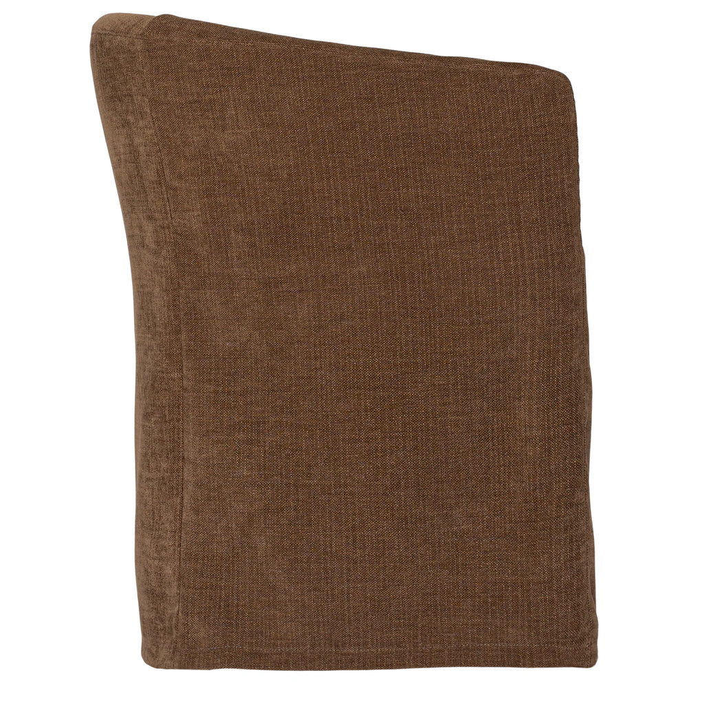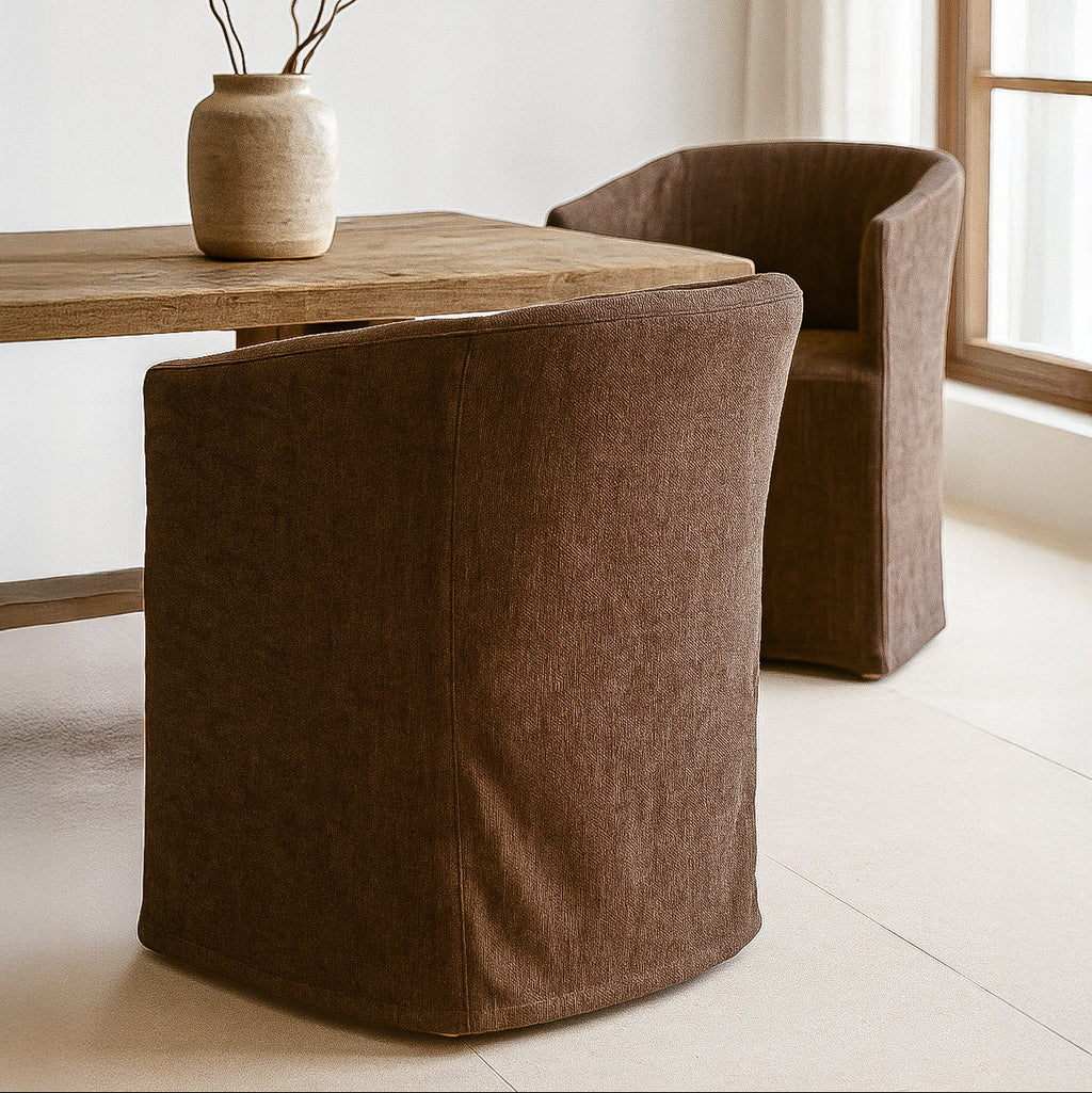 Each chair includes a removable slipcover, available in a selection of premium fabrics and leather finishes to suit a variety of interior styles. Its clean lines and skirted base create an elegant, understated aesthetic that transitions effortlessly between contemporary and classic spaces.
