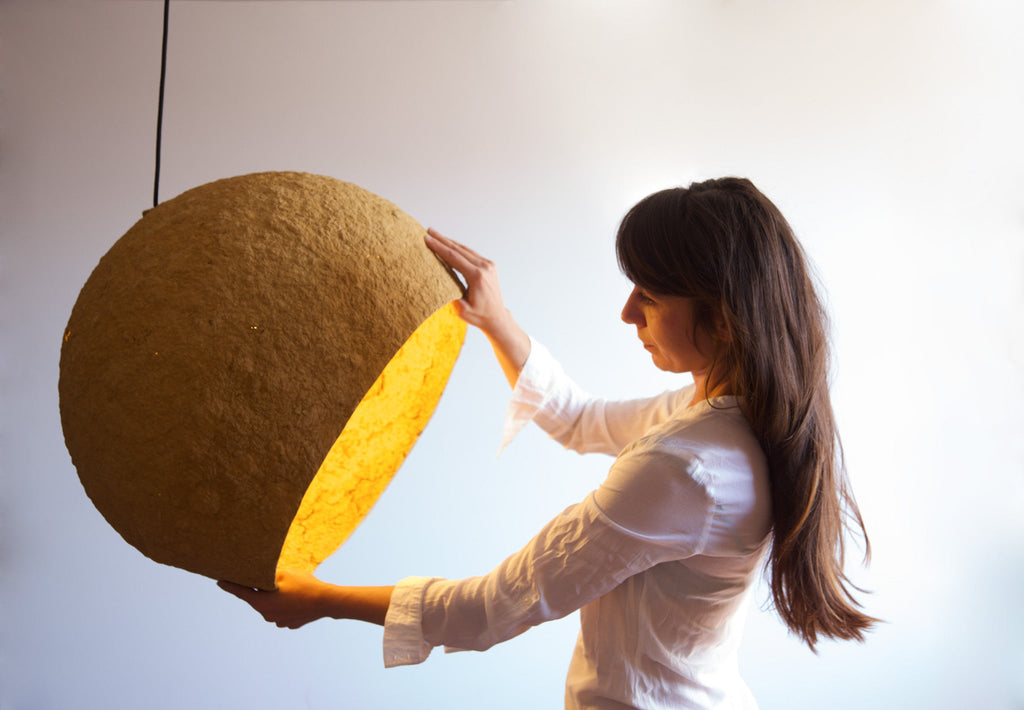 The paper-maché lamp refers with its shape and color to one of the planets of the solar system – Jupiter. It dominates with its size, just as Jupiter the is largest planet in the solar system. Due to an ocher color the lamp gives a pleasant and warm light. Its interior, when lit, seems to radiate the light and the walls of the lamp seem to be golden.