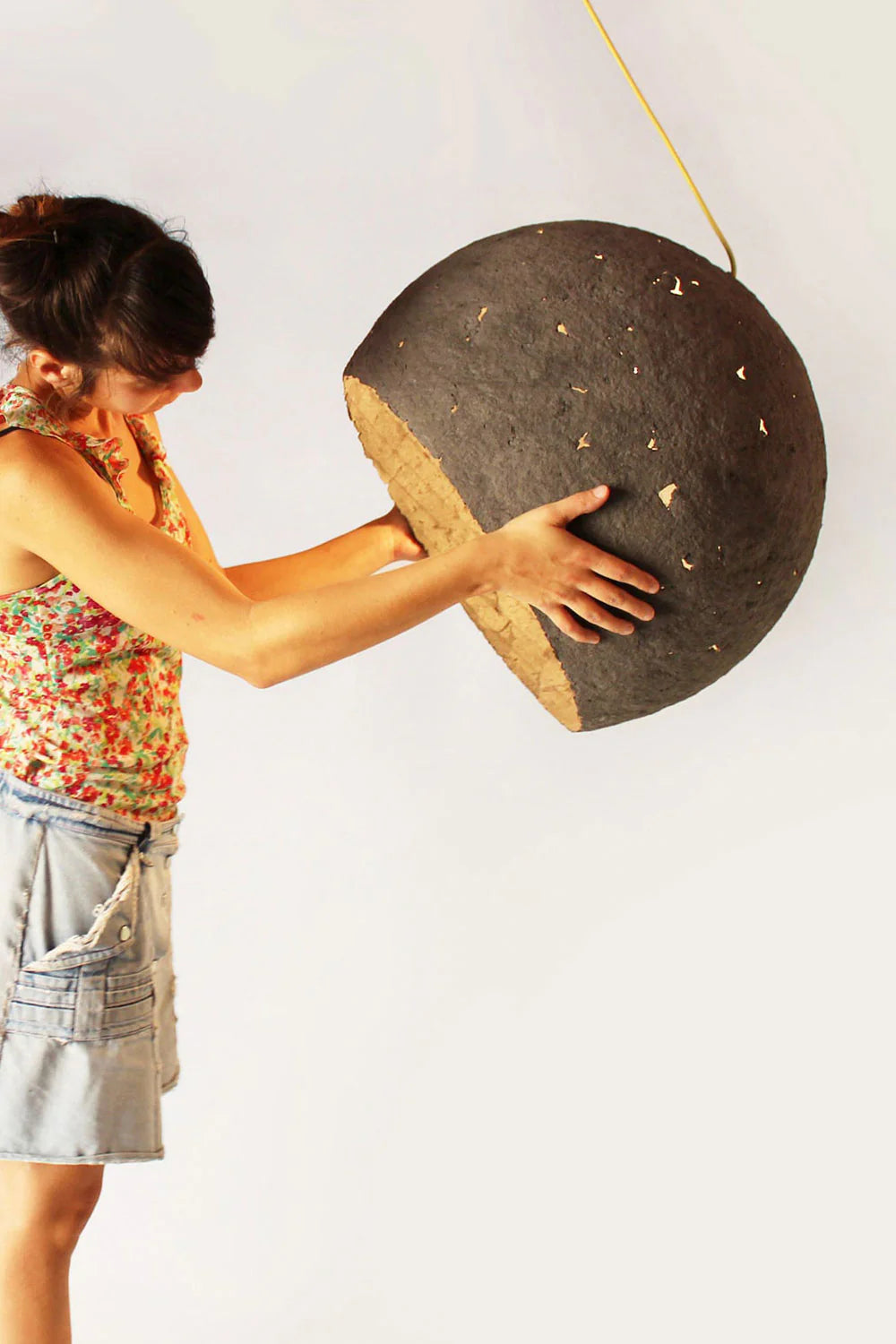 Impressive and organic, the Luna Pendant Lamp is 100% handmade in Barcelona from upcycled newspapers. Fitting in any contemporary environment such as the living room, bedroom, children's room, office, etc.