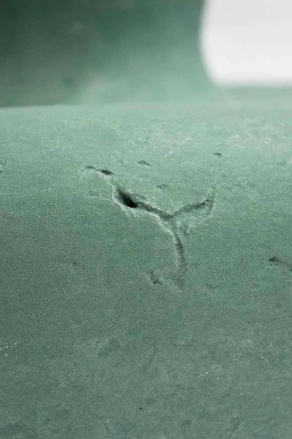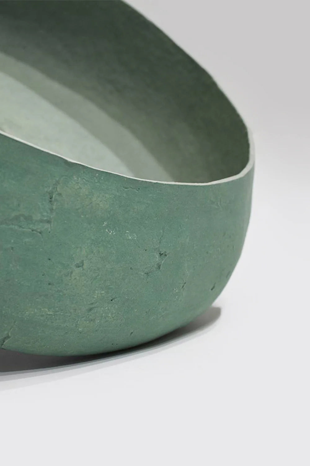 The paper used for this creation was destroyed, broken into tiny pieces, then transformed into a whole new material entity by a technique using heat. The "new" paper can be shaped in many different ways and in its final form brings an association with nature, its source.
