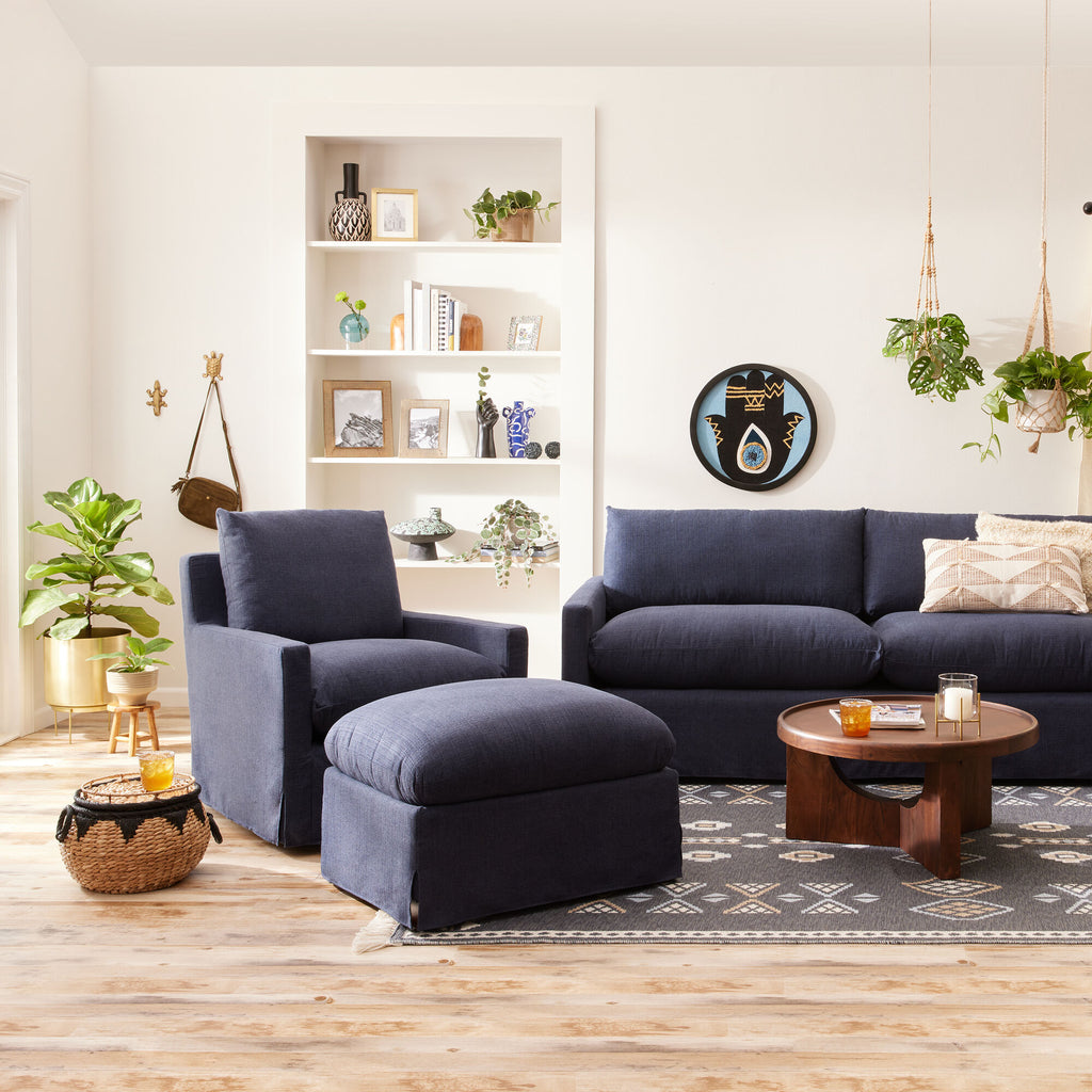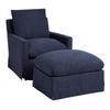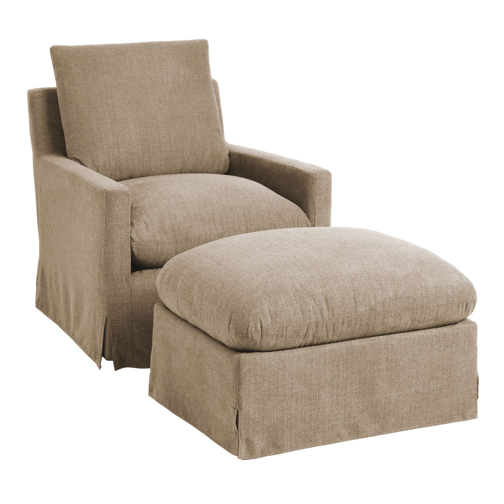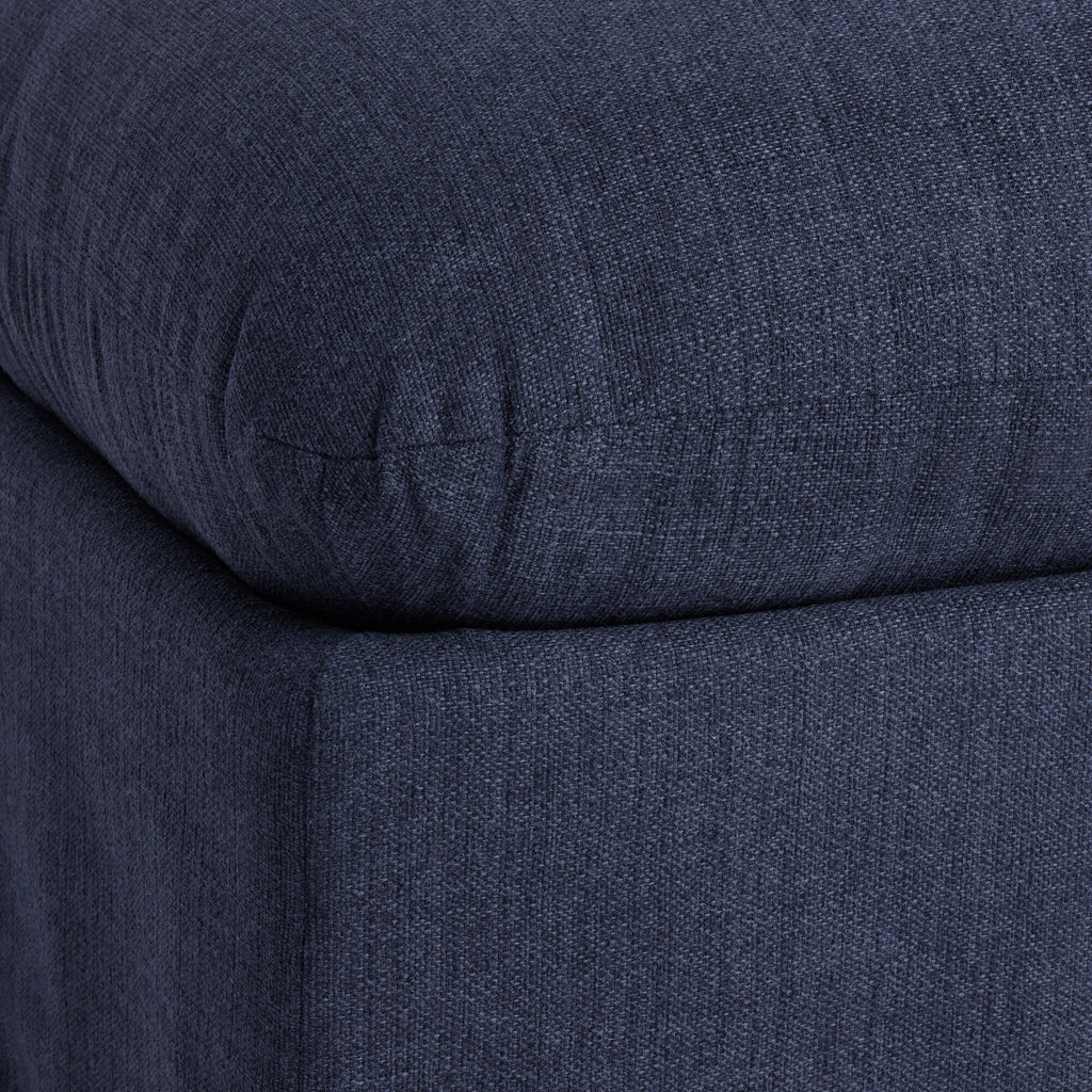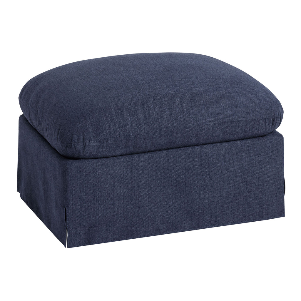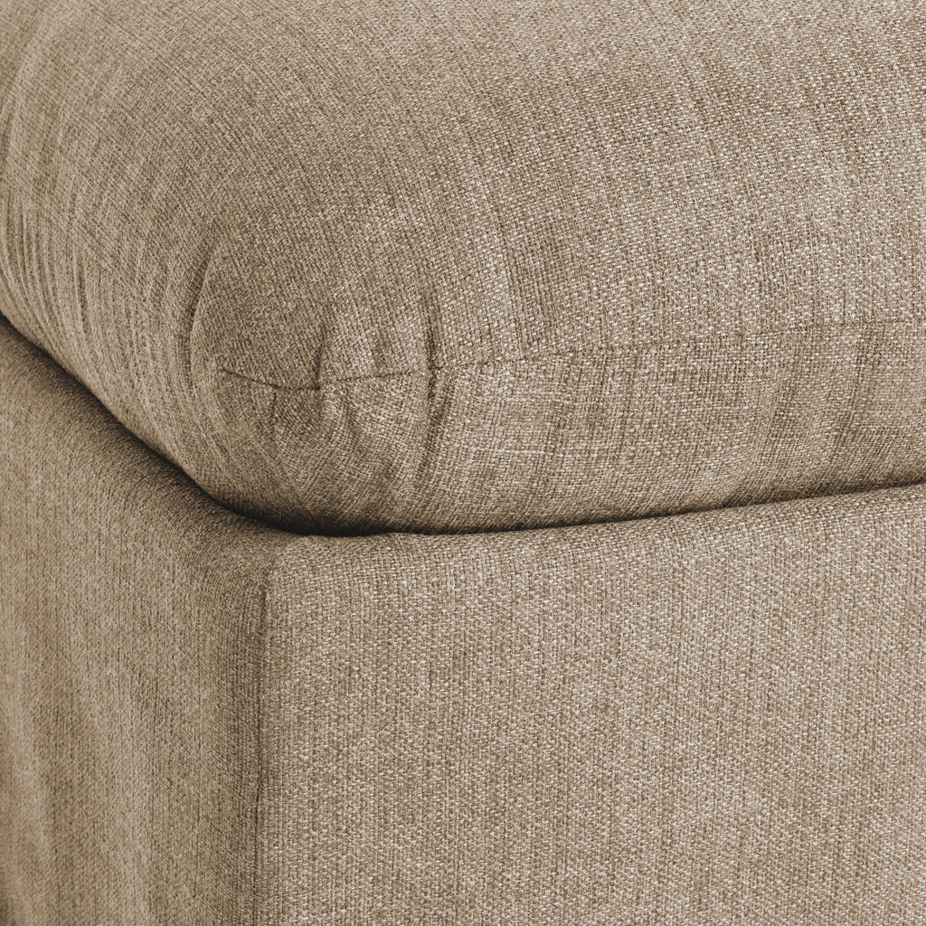 A custom-made footstool to pair with our iconic Brice swivel chair, it's available in the same color of upholstery to ensure a perfect match. With its large rectangular profile and feather-filled fixed cushion, this down ottoman also works as a plush standalone seat in any setting.