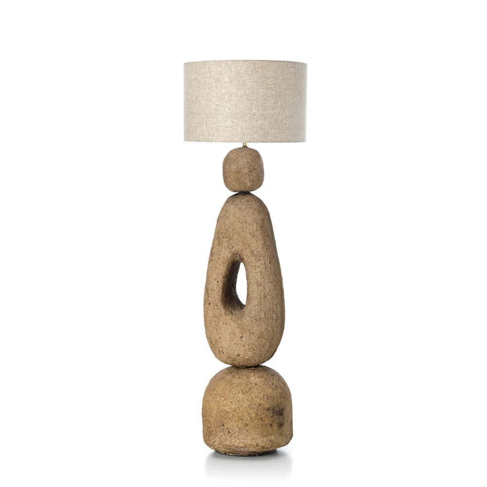 Grandeur meets craft in the Lampatha, an extra large floor lamp that commands attention with its towering silhouette. Crafted from papier-mâché in a tactile mud finish, it blends earthy rawness with bohemian refinement, creating a design that feels rooted yet contemporary.