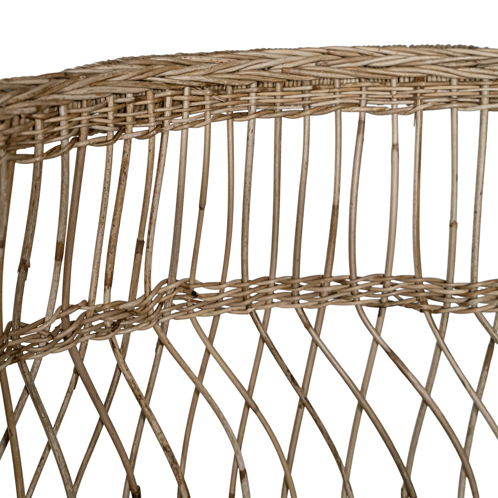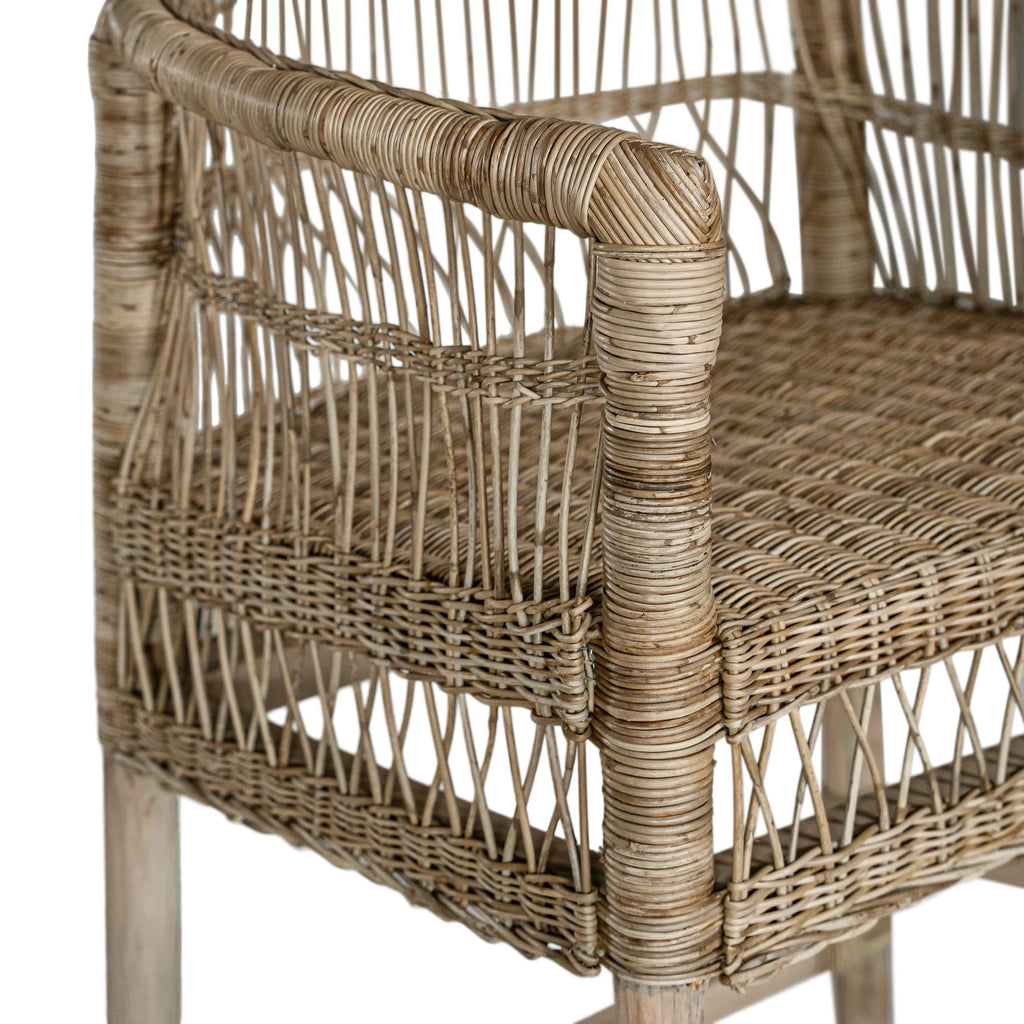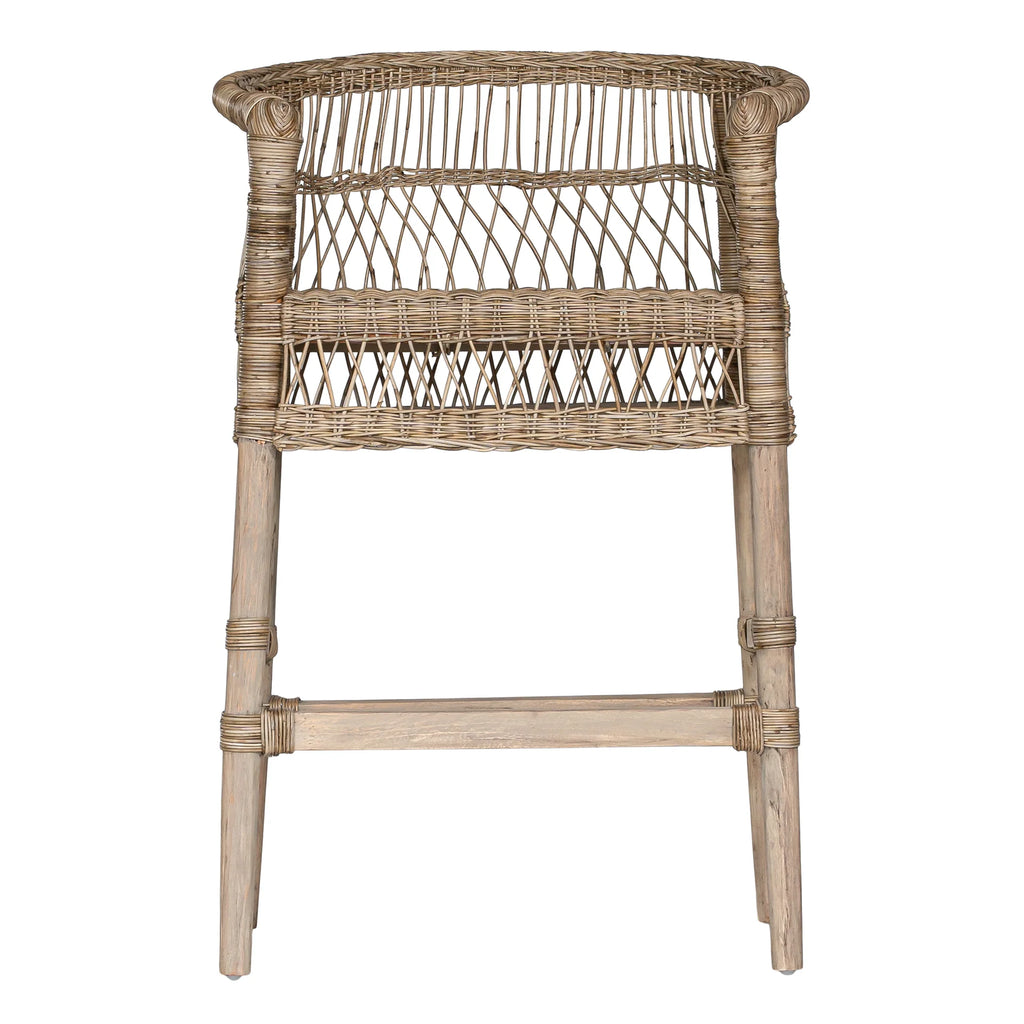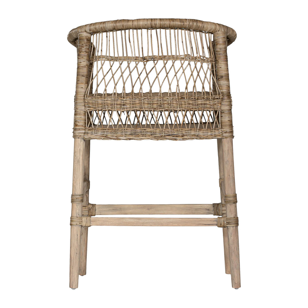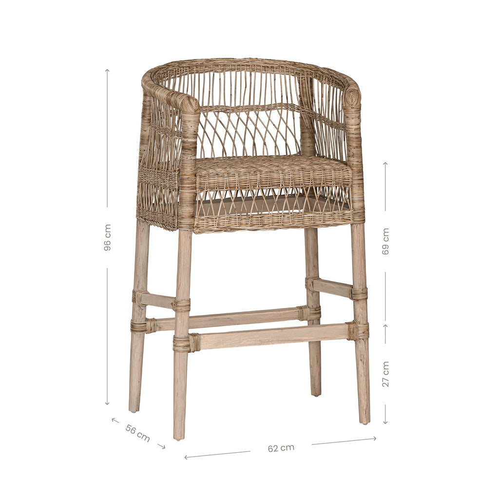Handwoven from rattan with a durable natural wood frame, this bar chair showcases a striking design that adds texture and warmth to any space. Its high back and comfortable seat provide support while maintaining an airy, open look. Perfect for both indoor and covered outdoor areas, the Malawi Bar Chair brings an organic, relaxed vibe to your home.