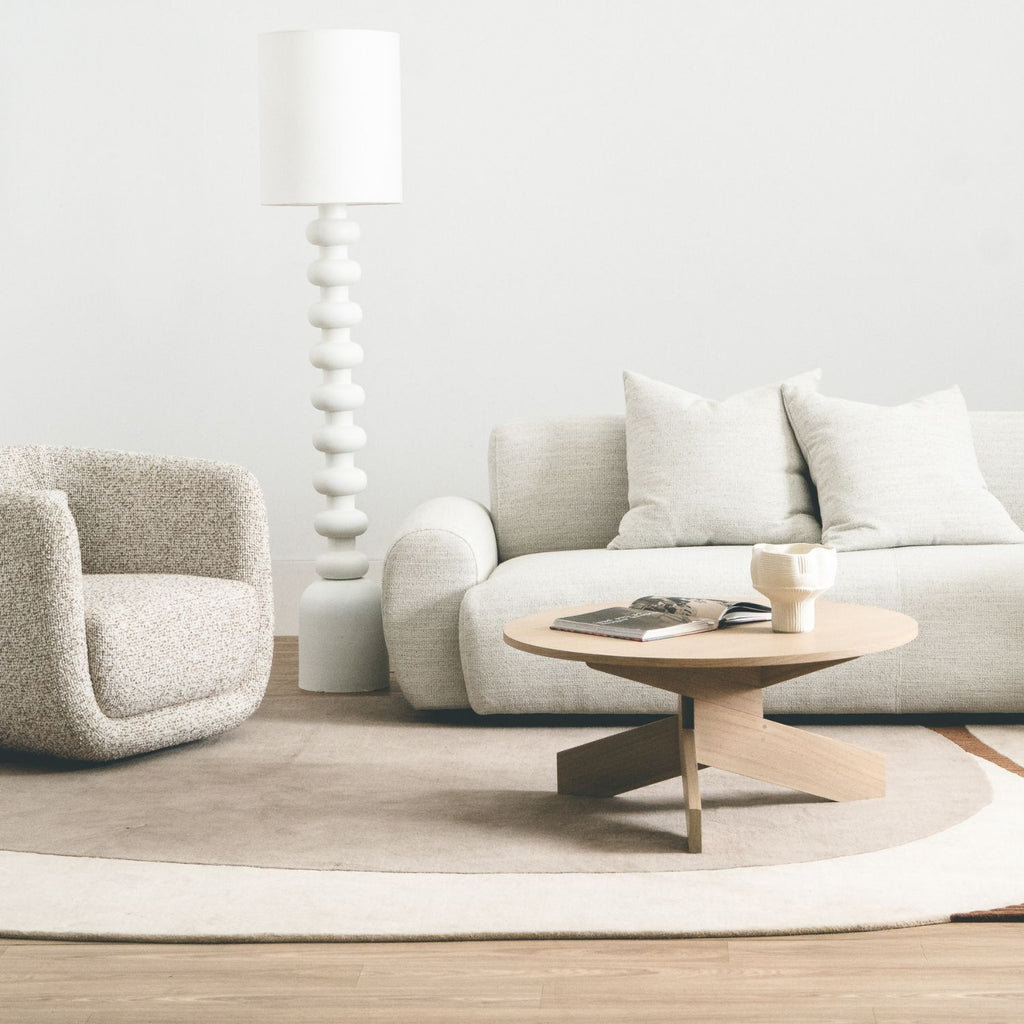 The Timothy Coffee Table combines clean lines with a touch of sculptural elegance, featuring a round timber top and a distinctive geometric base.