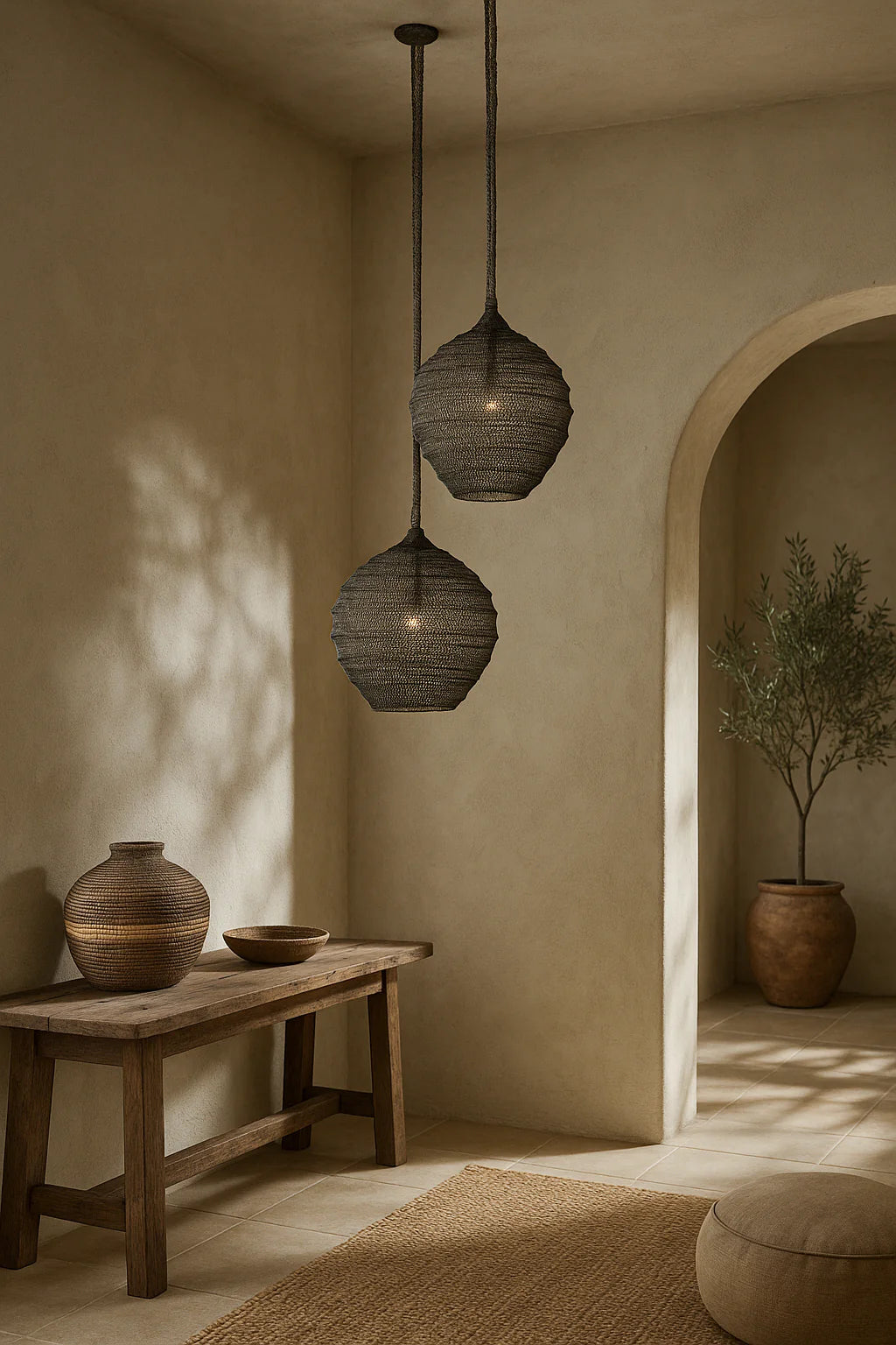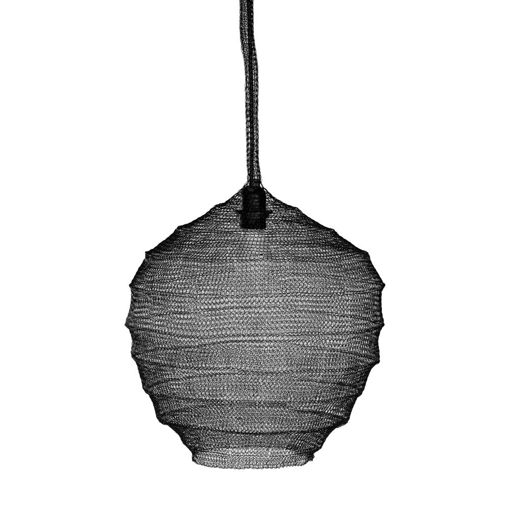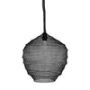 This striking black pendant light adds a sculptural element to any room, creating a dramatic focal point while casting a soft, ambient glow. The handcrafted nature of the mesh ensures each piece is unique, with natural variations in the paint finish that reveal glimpses of the silver wire beneath—this is part of its design and adds to its charm.
