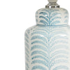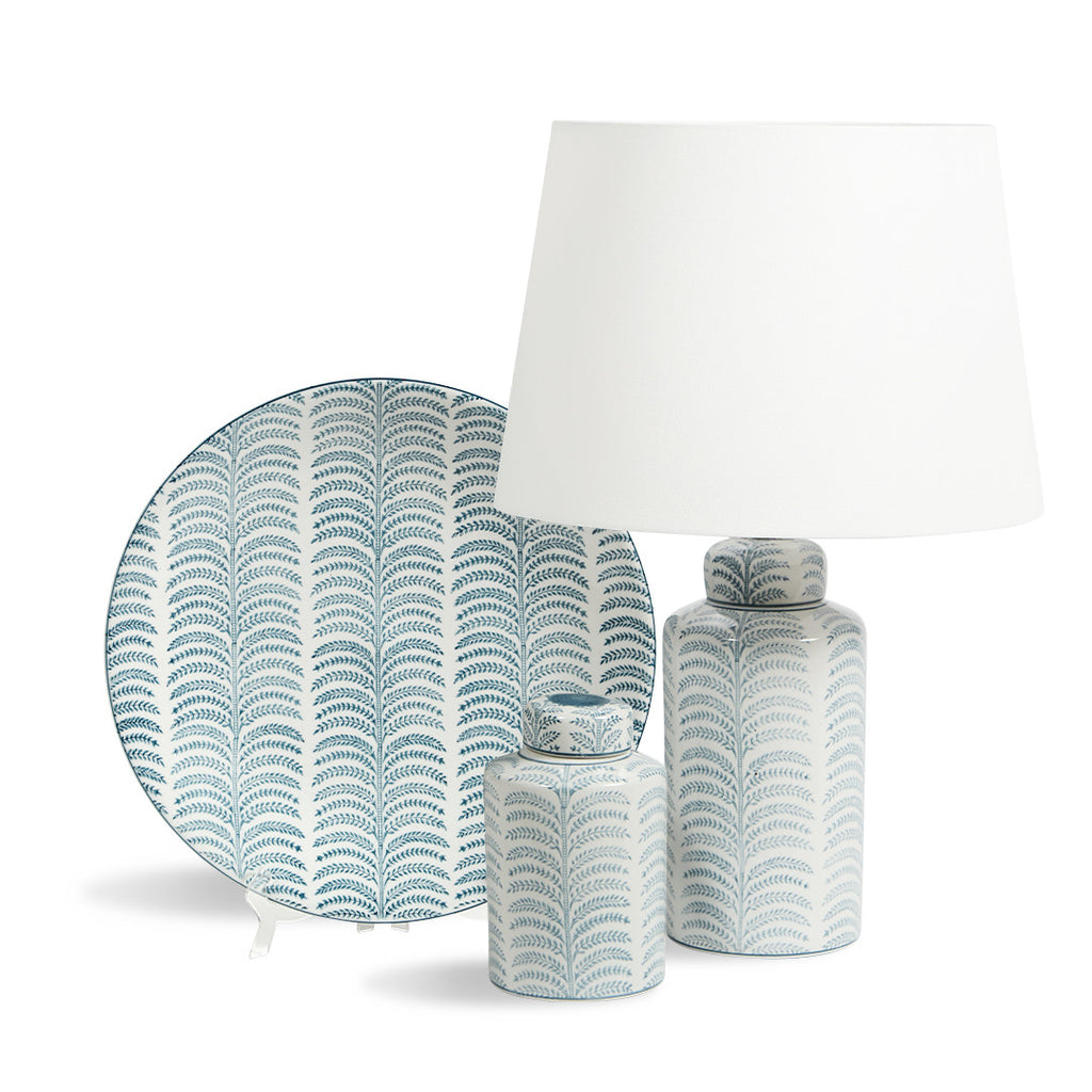 The Ferne Lamp is finished in a duck egg blue and off-white painted fern pattern on a ceramic base, complemented with a white shade.