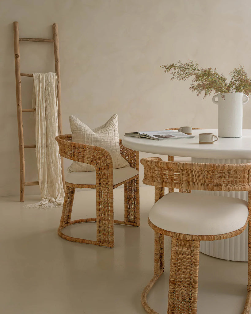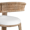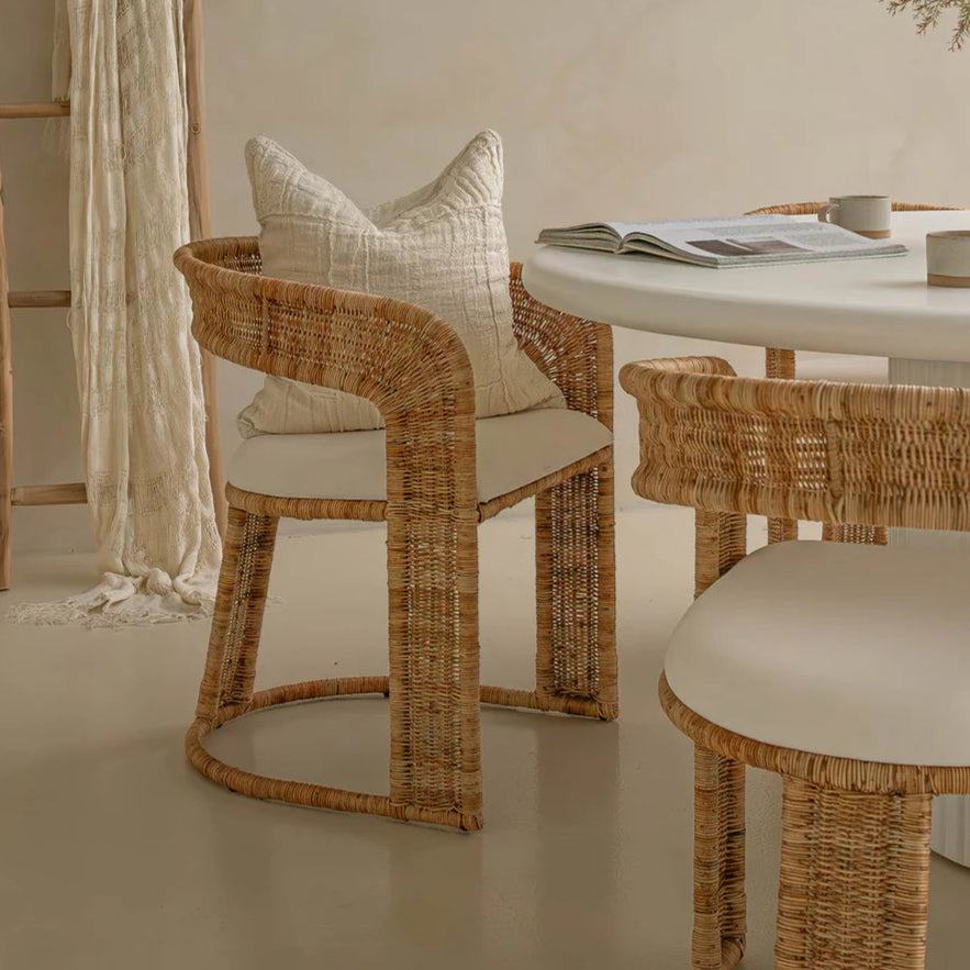 Expertly crafted, this chair features a gracefully curved design and a frame covered in handwoven natural rattan, creating a timeless and elegant look.