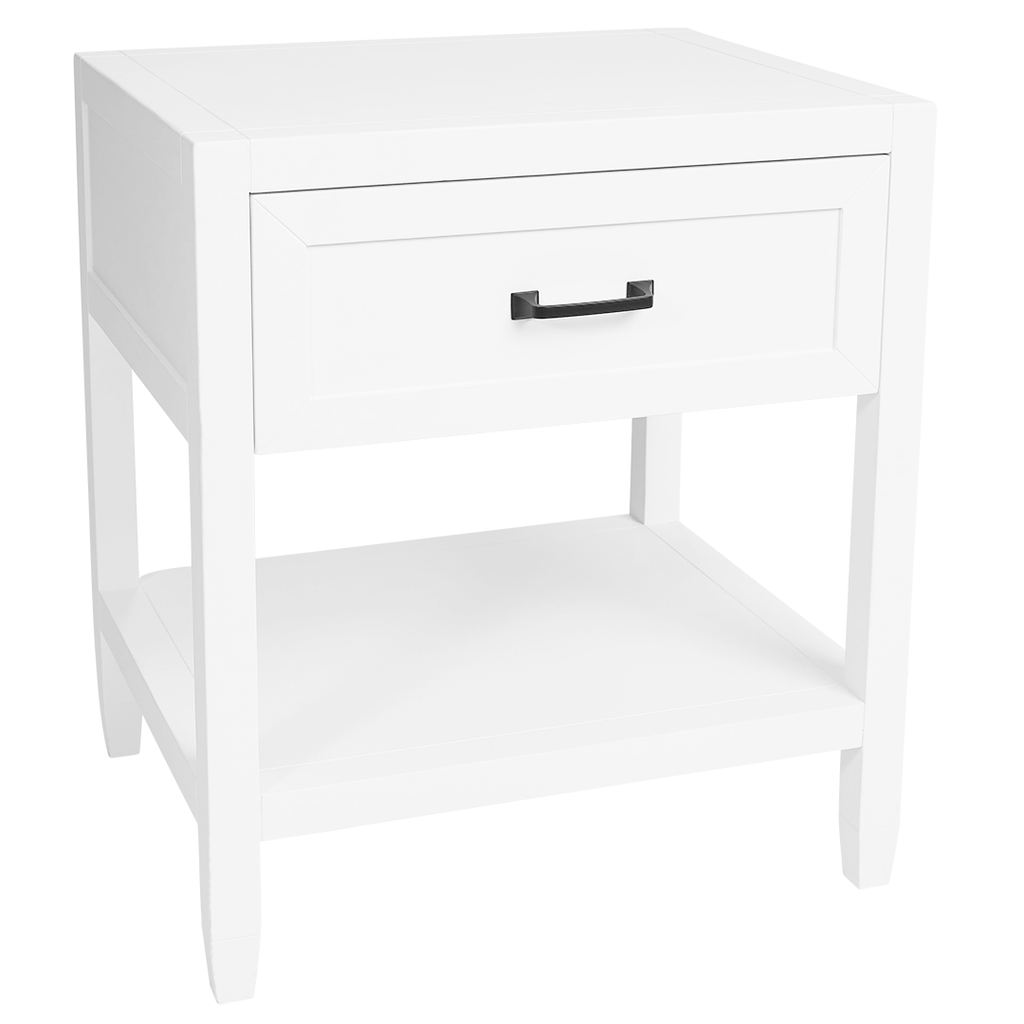 Simple in design the Guild Bedside Table is painted in beautiful classic white with black hardware, a tapered leg and simple routed detail along the top and shelf.