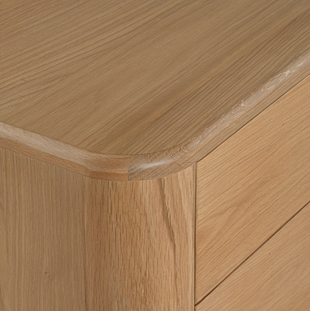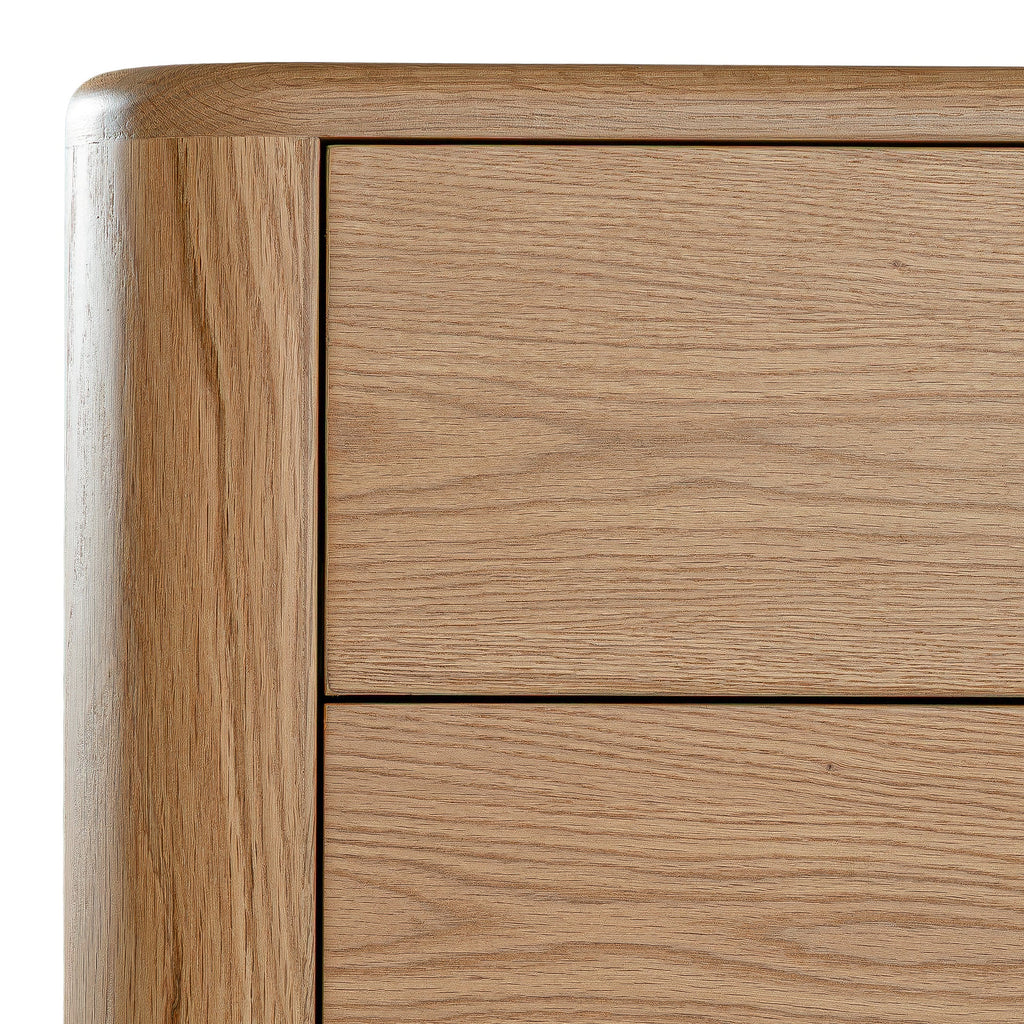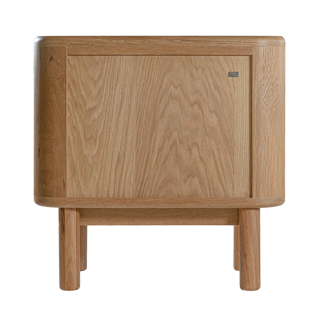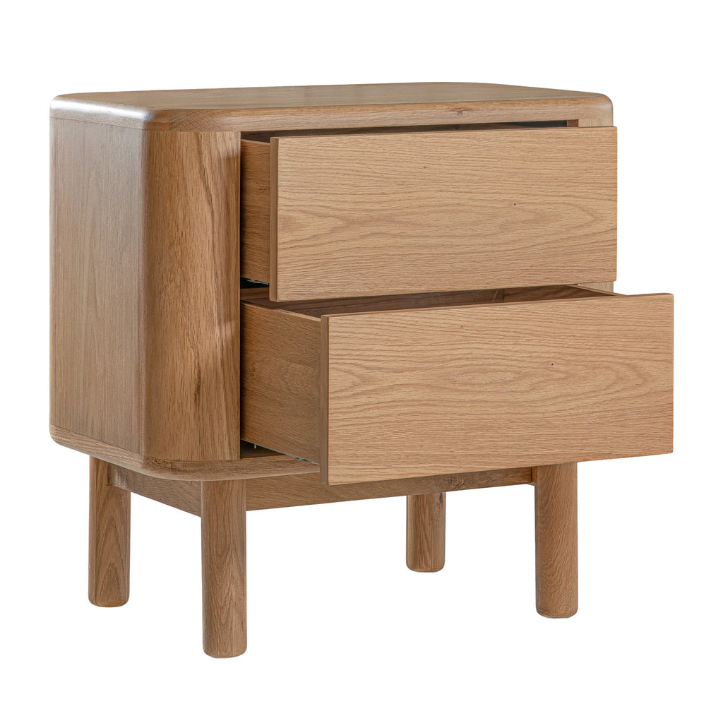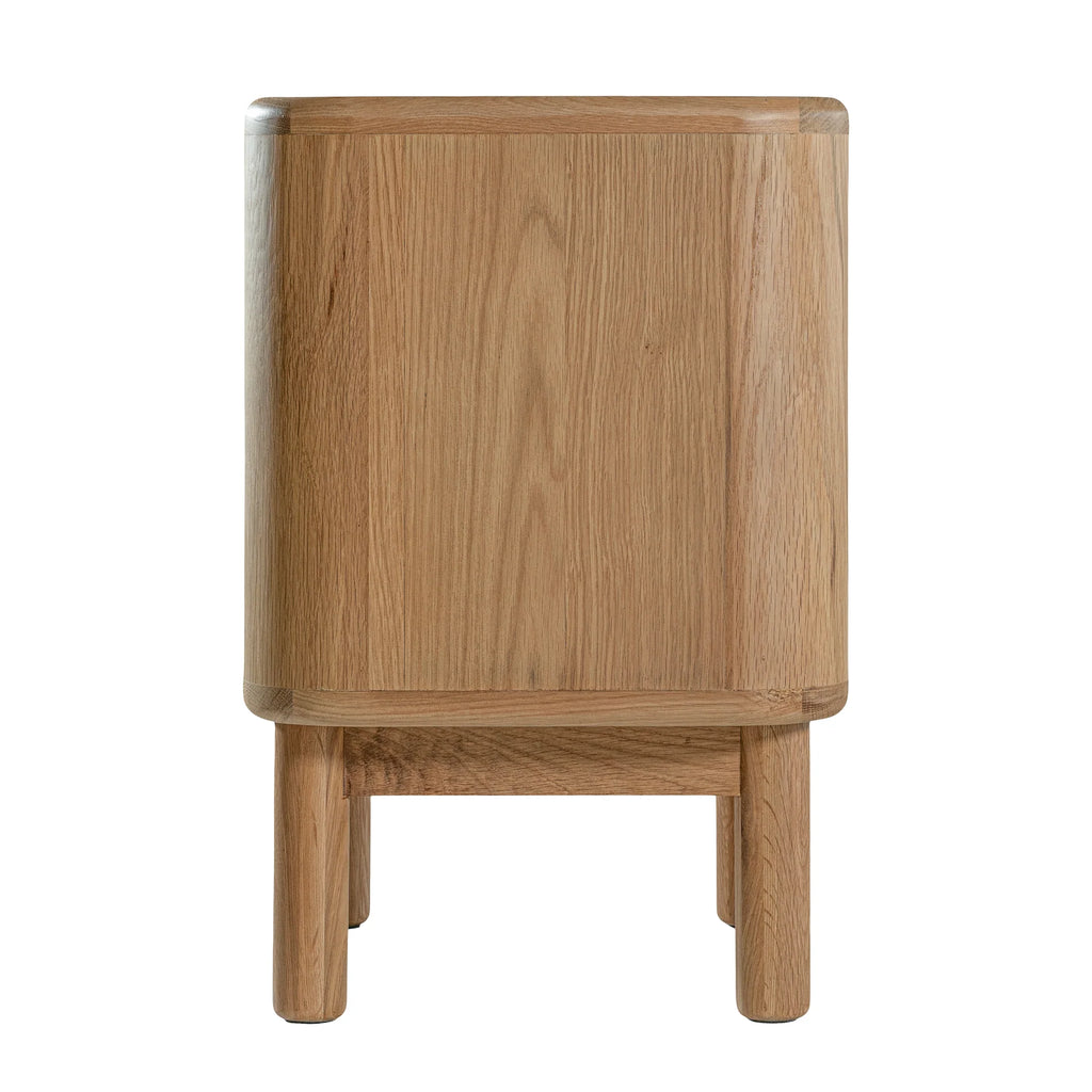 Crafted with a natural oak veneer and supported by solid oak legs, this bedside brings a warm, organic feel to your space while maintaining a sleek, modern silhouette.