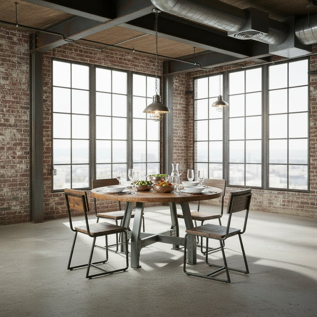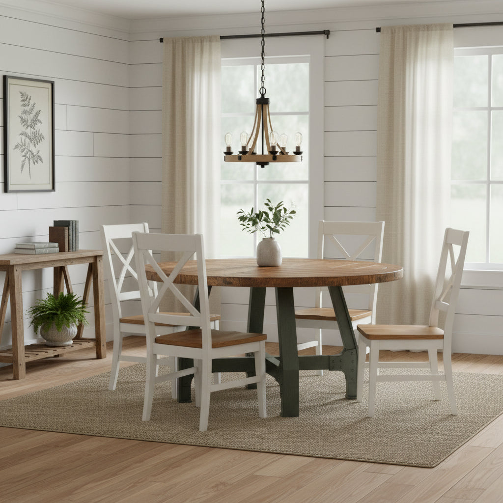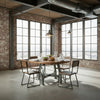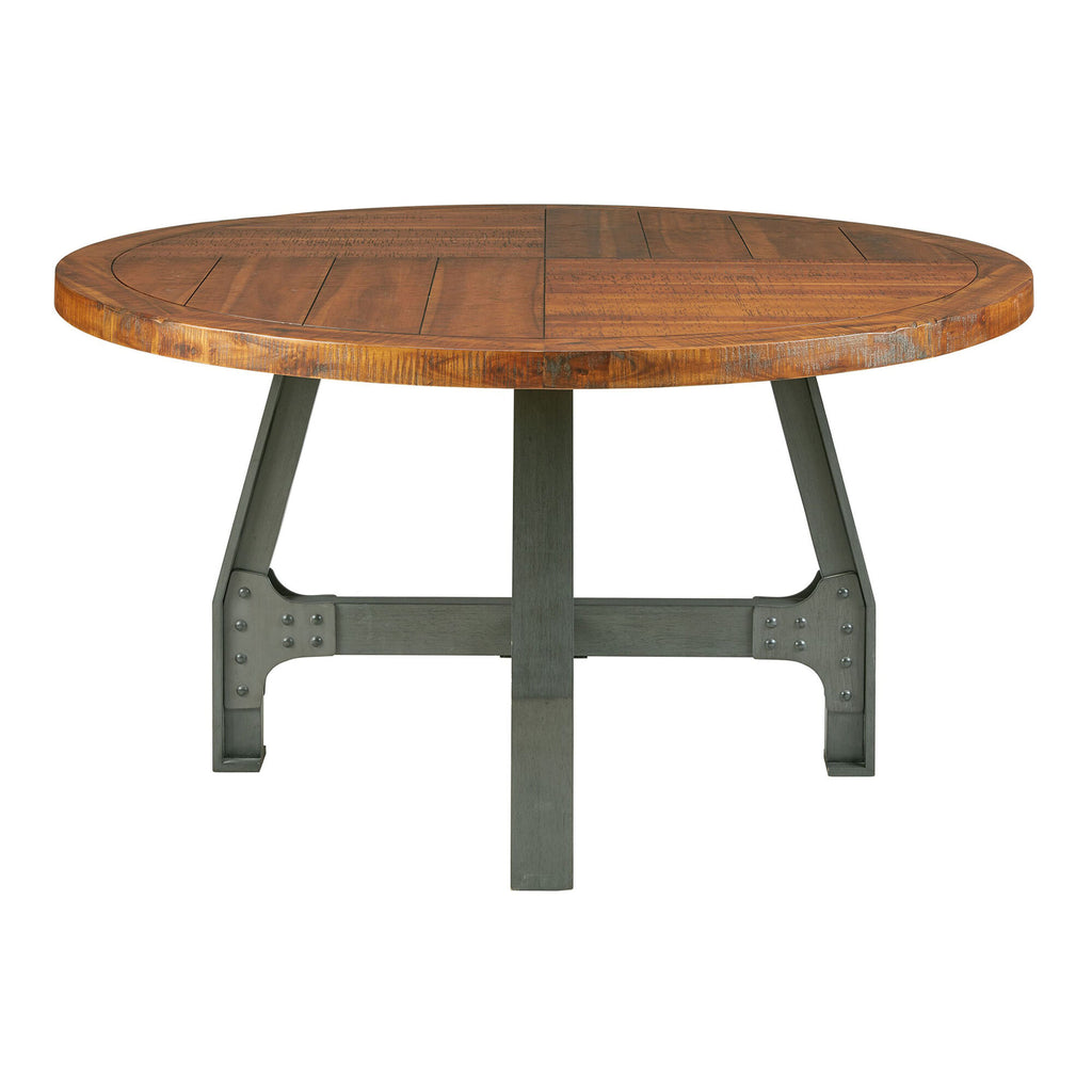 Crafted with an acacia surface in warm amber, the Jenn's tabletop features contrasting woodgrain patterns and its graphite painted-wood base is accented with metal rivets. Pair this adjustable dinner table with six dining chairs or counter stools to host friends and family on any occasion.