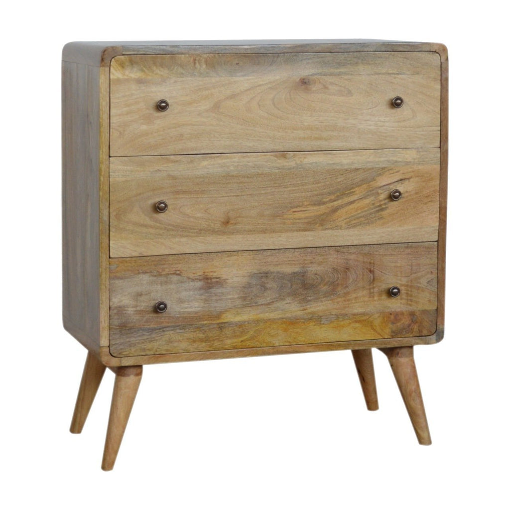 To match the other products from the curved collection, this chest of drawers has been constructed from 100% solid mango wood in a fine oakish finish and stands on 4 Nordic style legs.