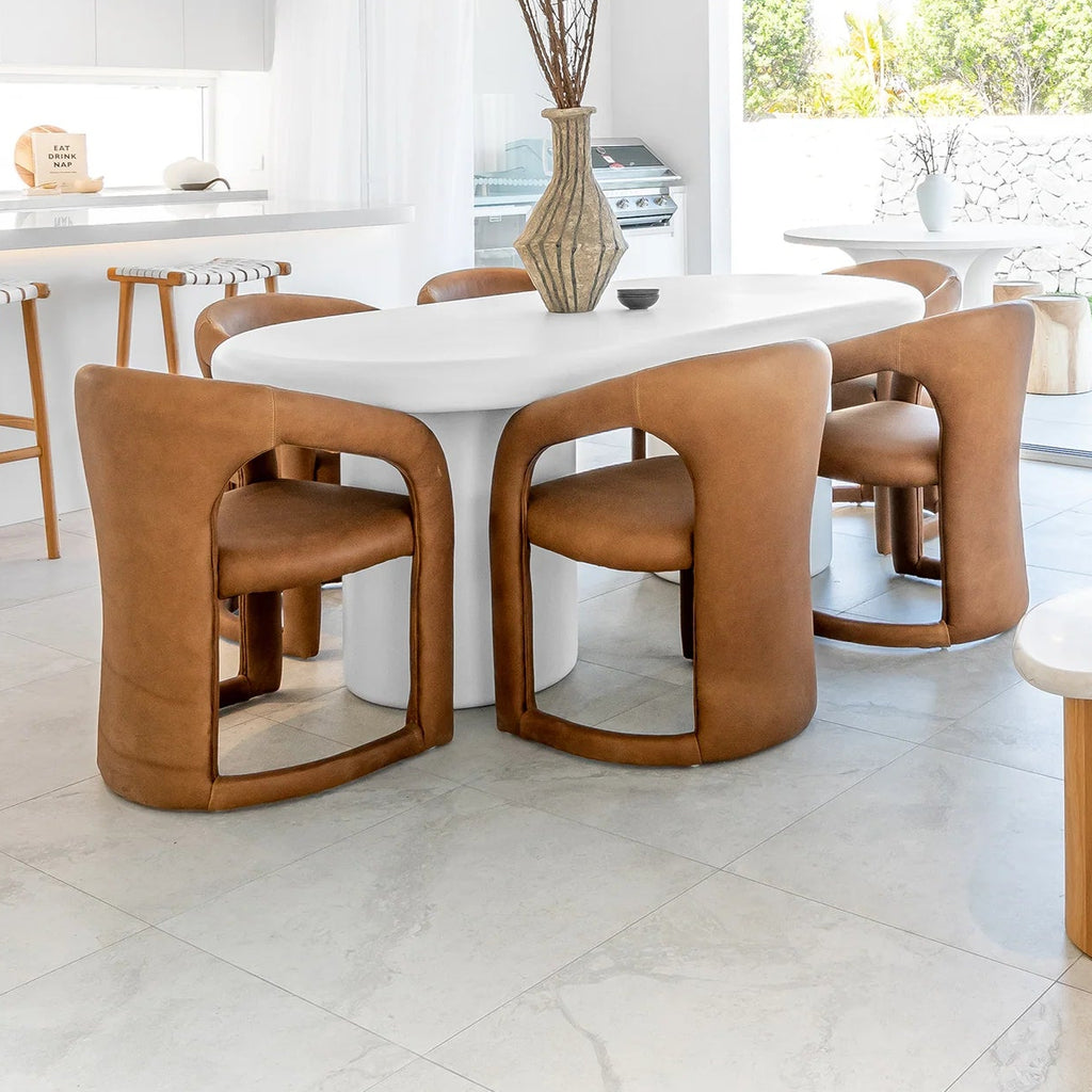 With its unique shape, swooping open back, tightly upholstered seat, and softly rounded silhouette, the Fikile Dining Chair serves as both a striking statement piece and a functional addition to any decor.