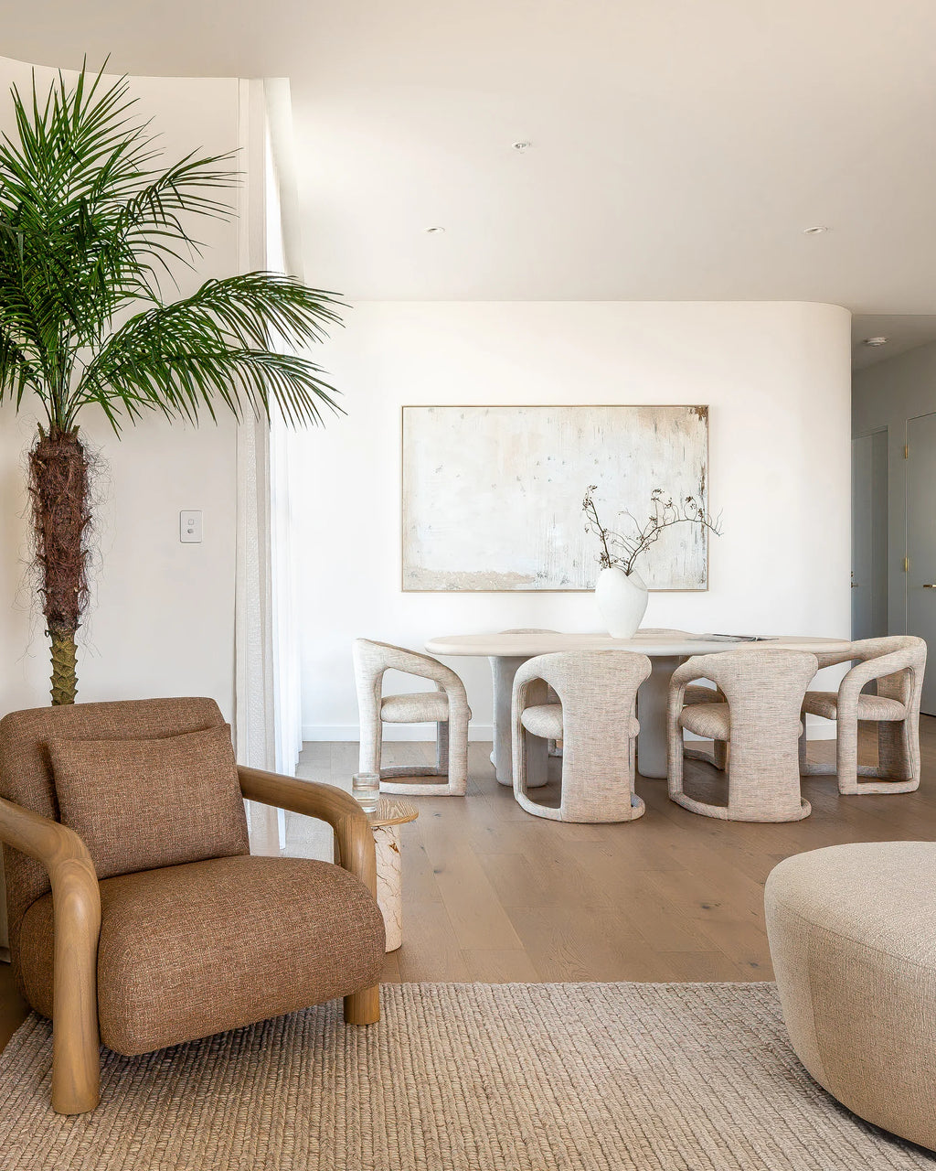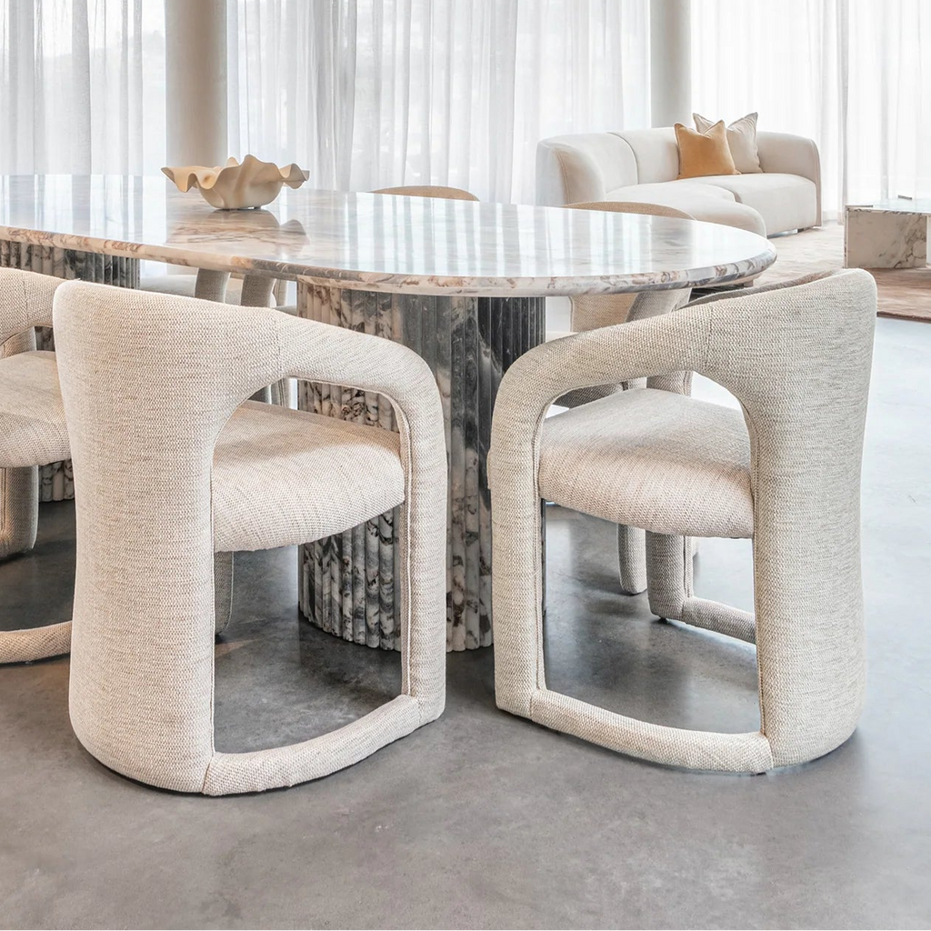With its unique shape, swooping open back, tightly upholstered seat, and softly rounded silhouette, the Fikile Dining Chair serves as both a striking statement piece and a functional addition to any decor.