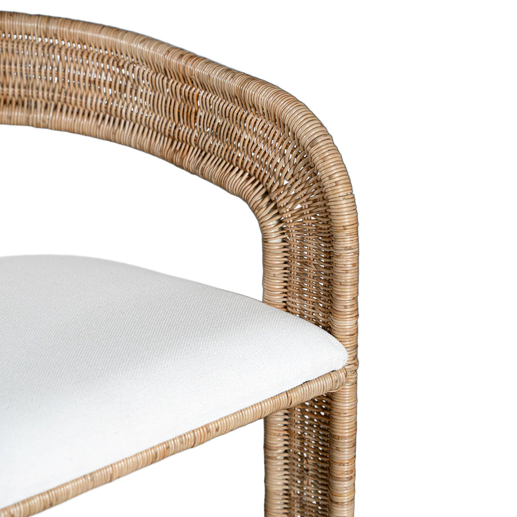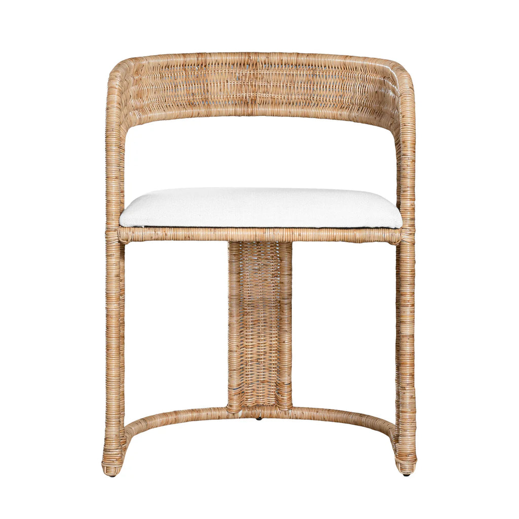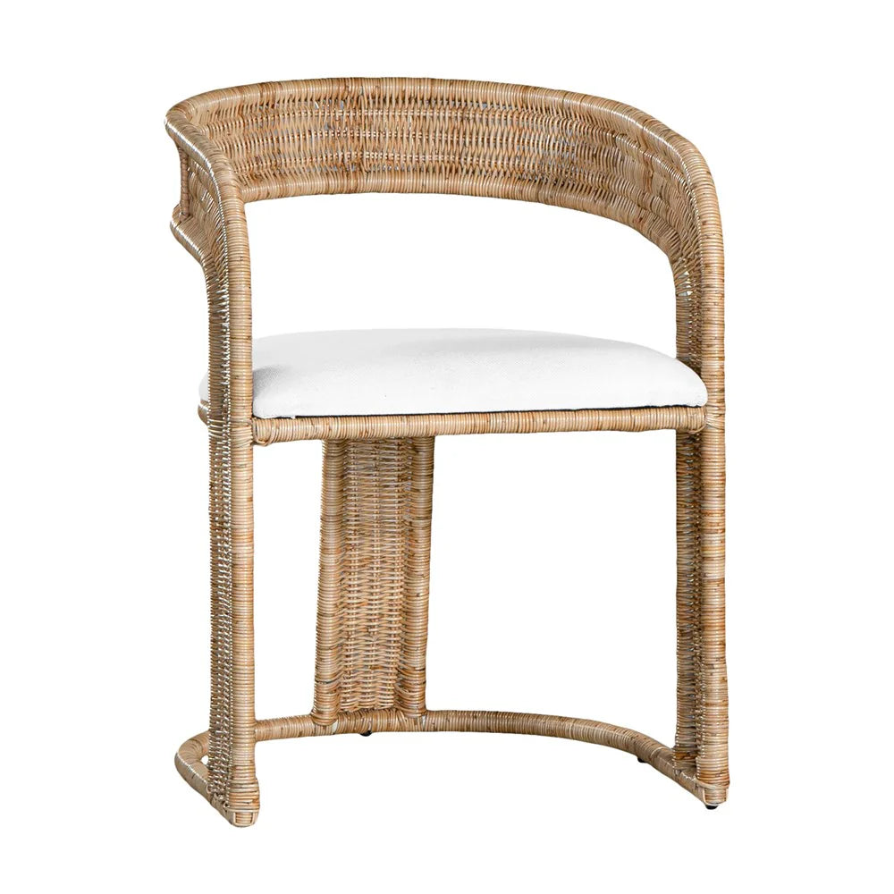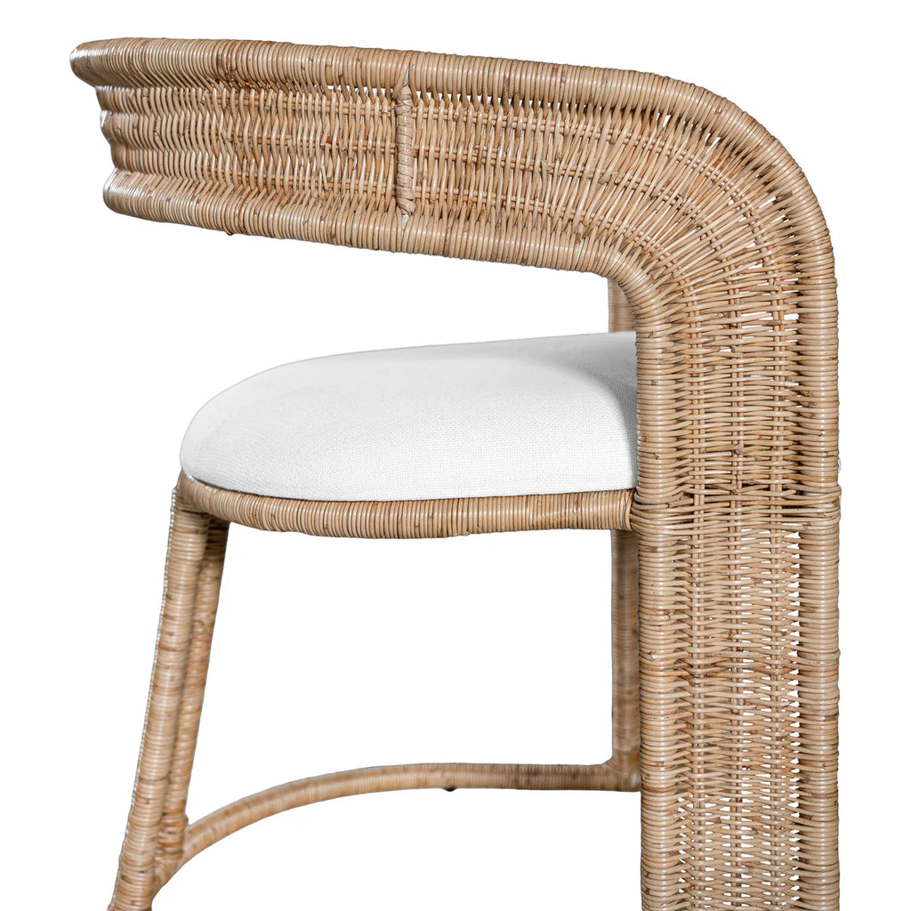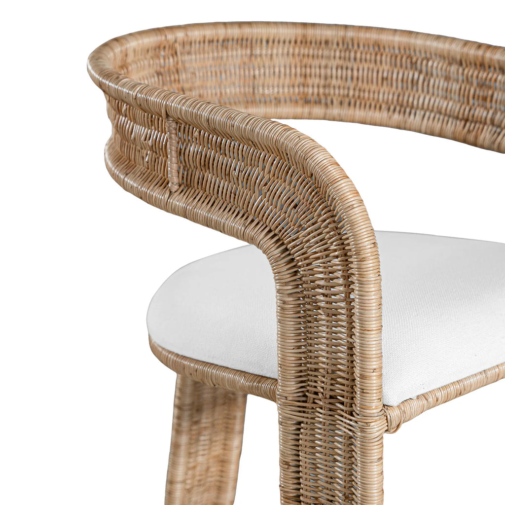 Expertly crafted, this chair features a gracefully curved design and a frame covered in handwoven natural rattan, creating a timeless and elegant look.