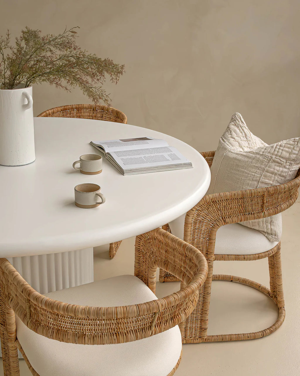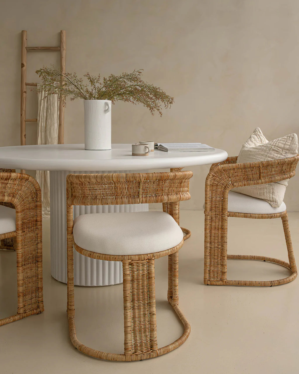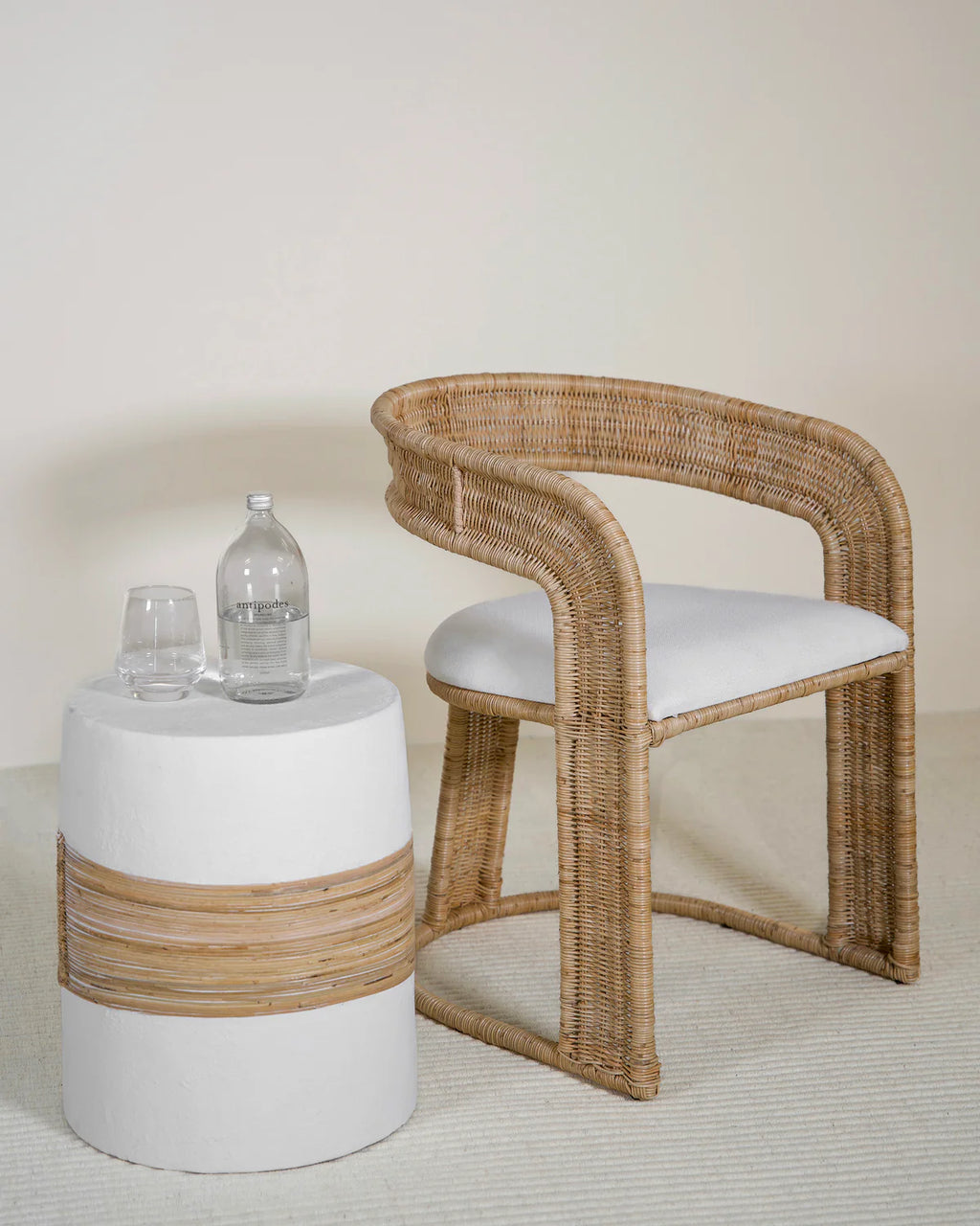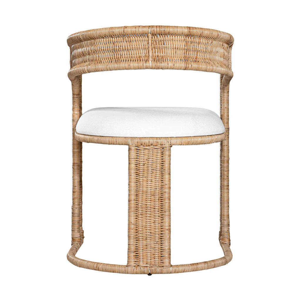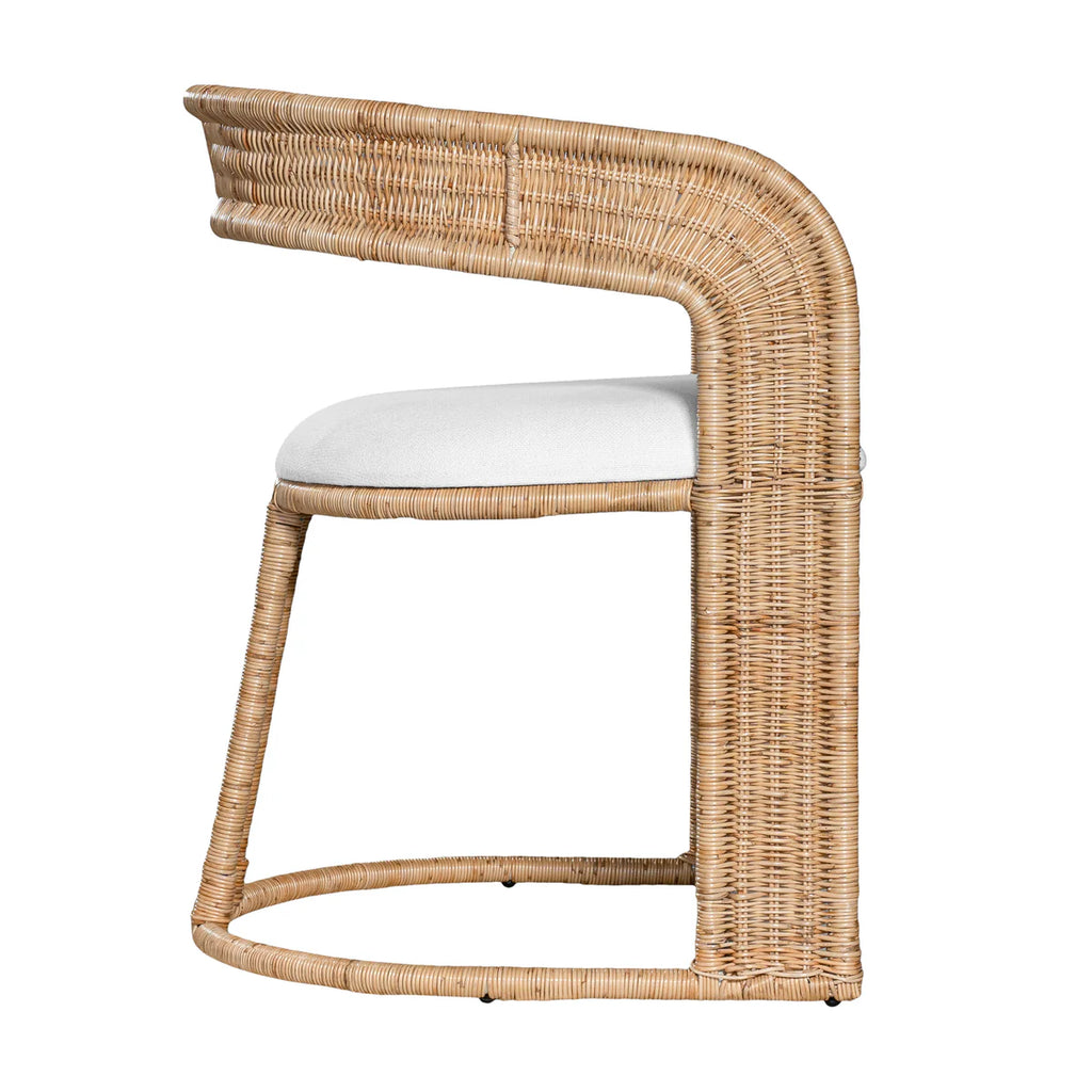 Expertly crafted, this chair features a gracefully curved design and a frame covered in handwoven natural rattan, creating a timeless and elegant look.
