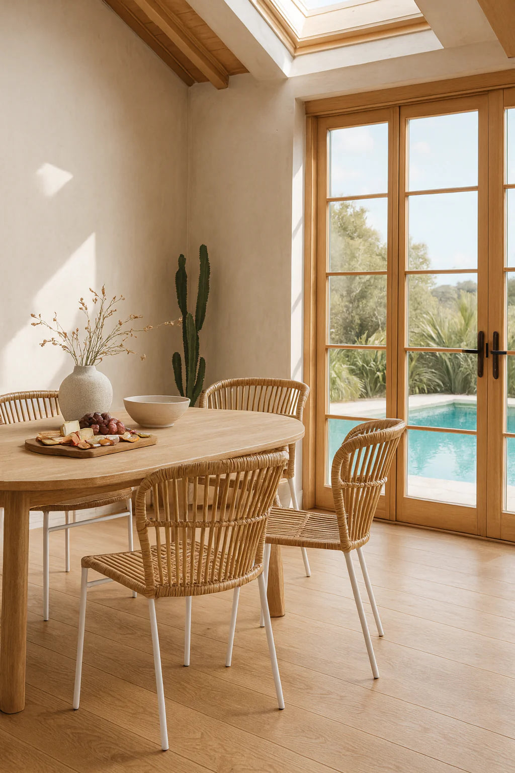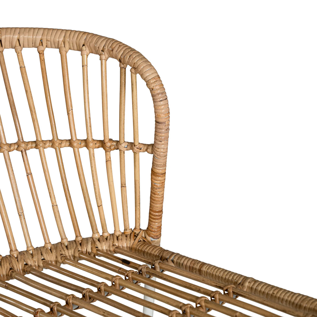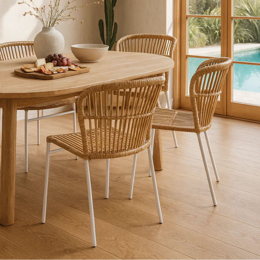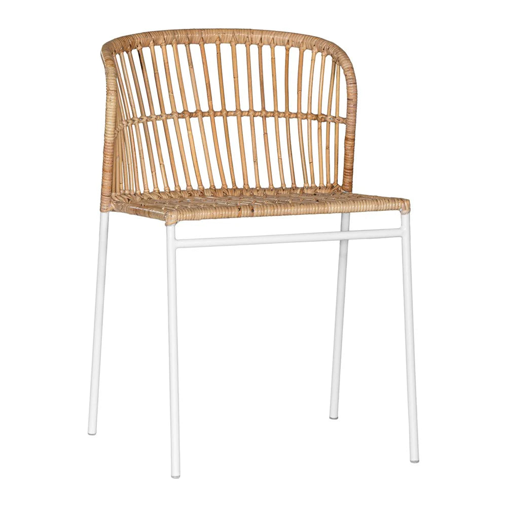 The Meru Dining Chair combines natural rattan with sleek metal legs to create a modern, airy seating option.