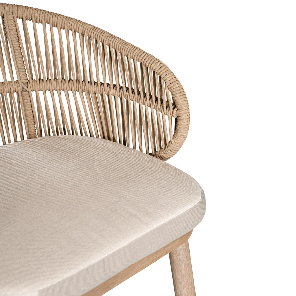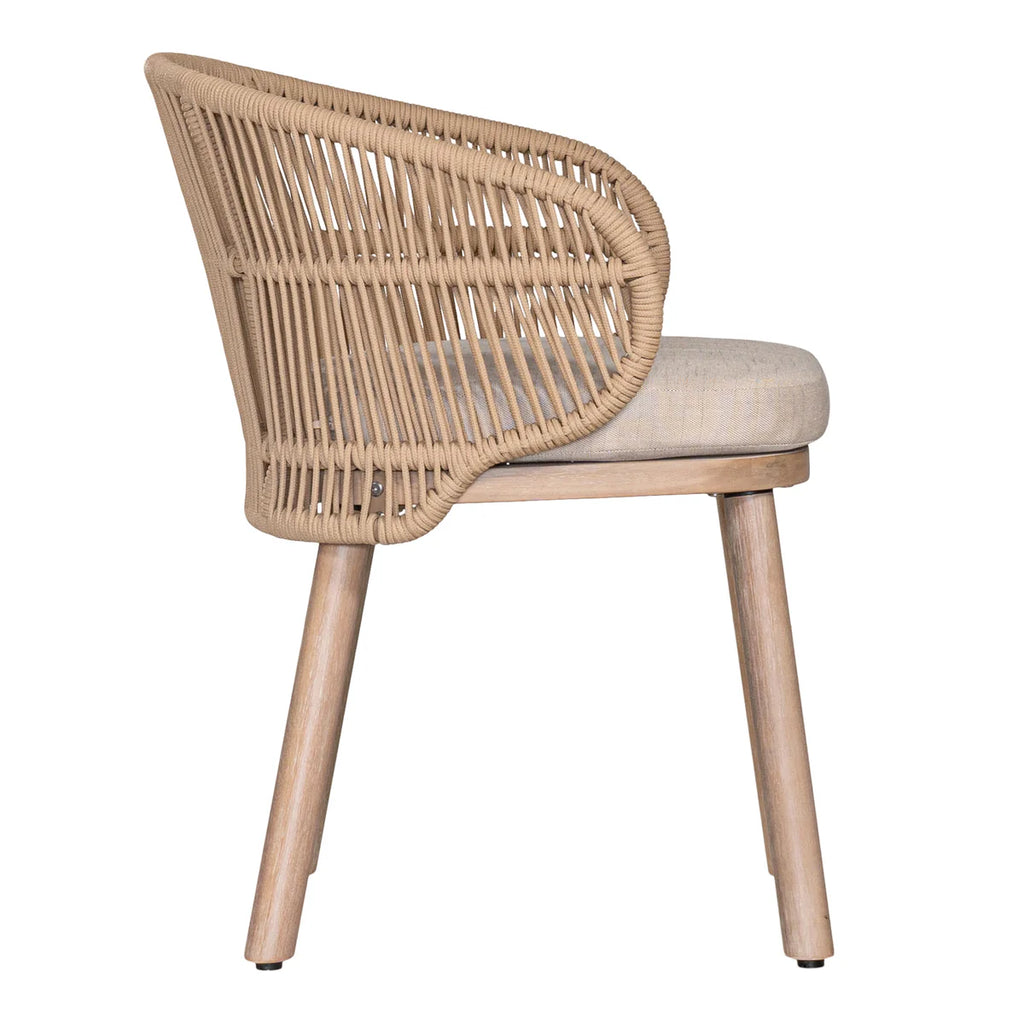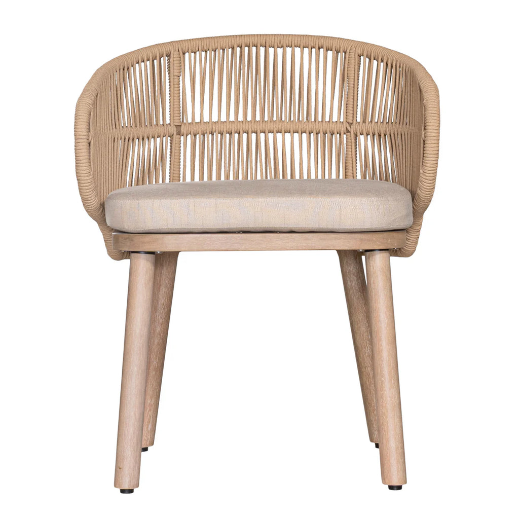 Crafted from Eucalyptus Grandis wood and featuring an aluminium frame, the Maya Dining Chair is designed for durability. Its fishbone-style rope weaving adds texture and charm, while the comfortable seat cushion ensures a cosy seating experience. Though suitable for outdoor use, we recommend placing the chair in covered areas, as the cushion insert is foam.