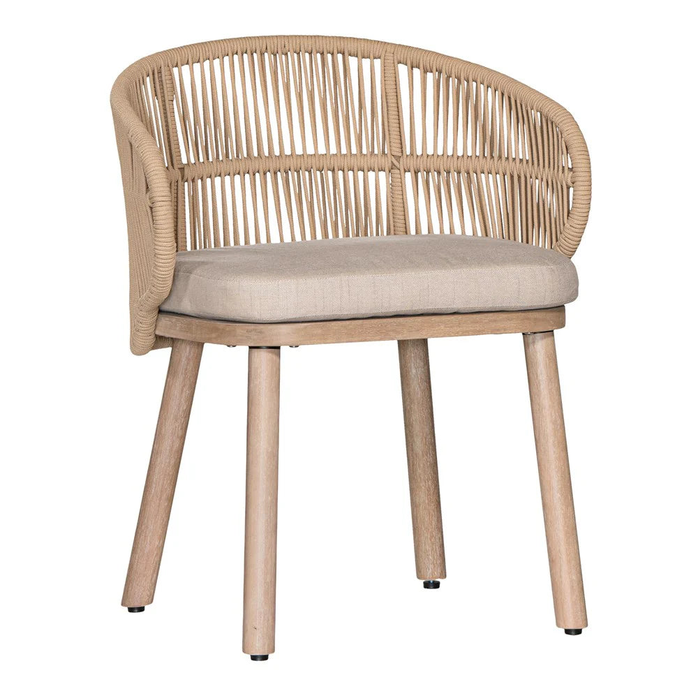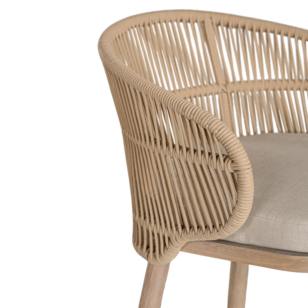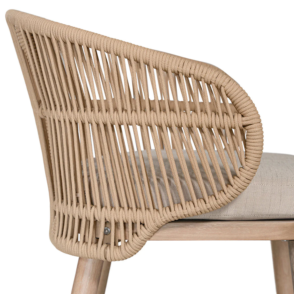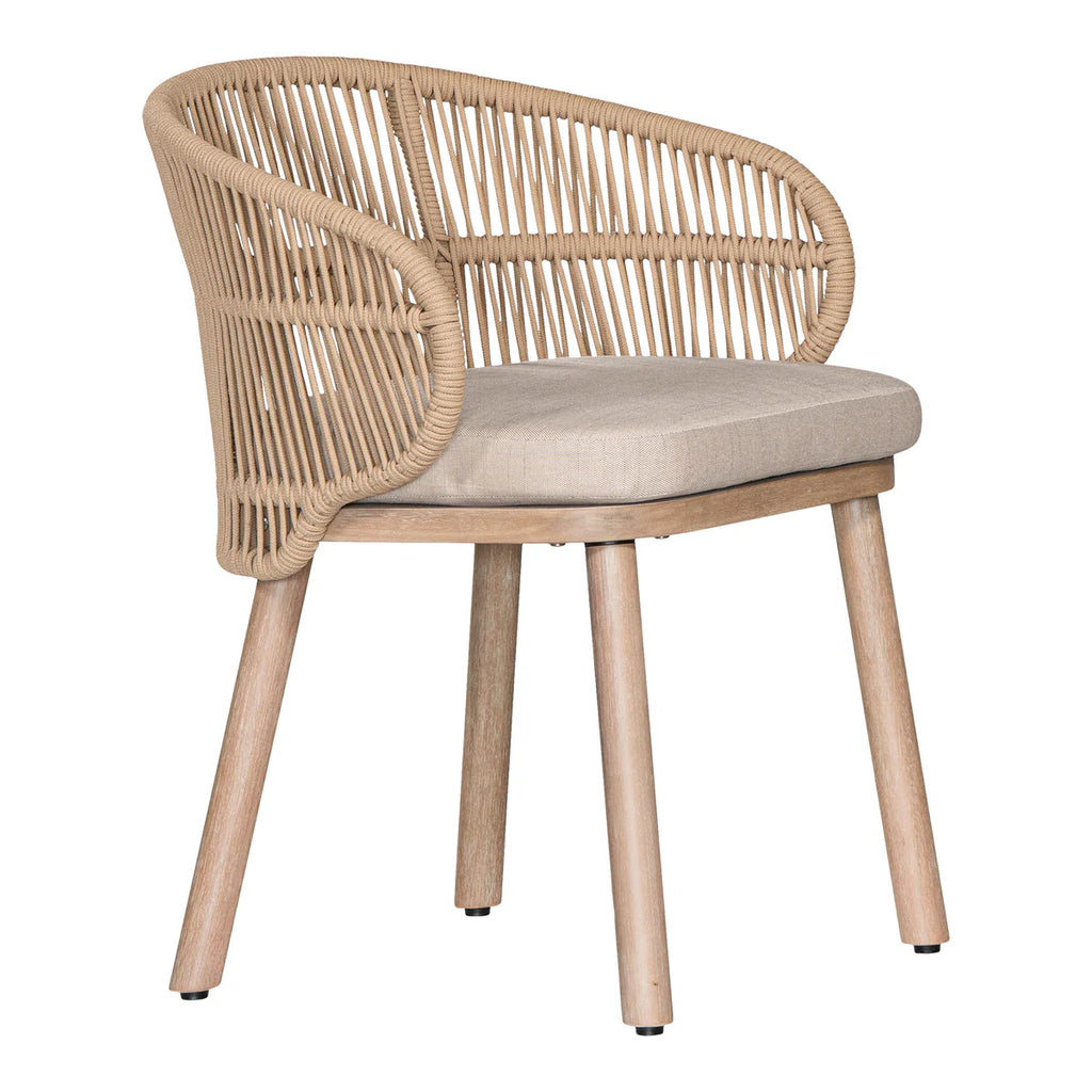 Crafted from Eucalyptus Grandis wood and featuring an aluminium frame, the Maya Dining Chair is designed for durability. Its fishbone-style rope weaving adds texture and charm, while the comfortable seat cushion ensures a cosy seating experience. Though suitable for outdoor use, we recommend placing the chair in covered areas, as the cushion insert is foam.
