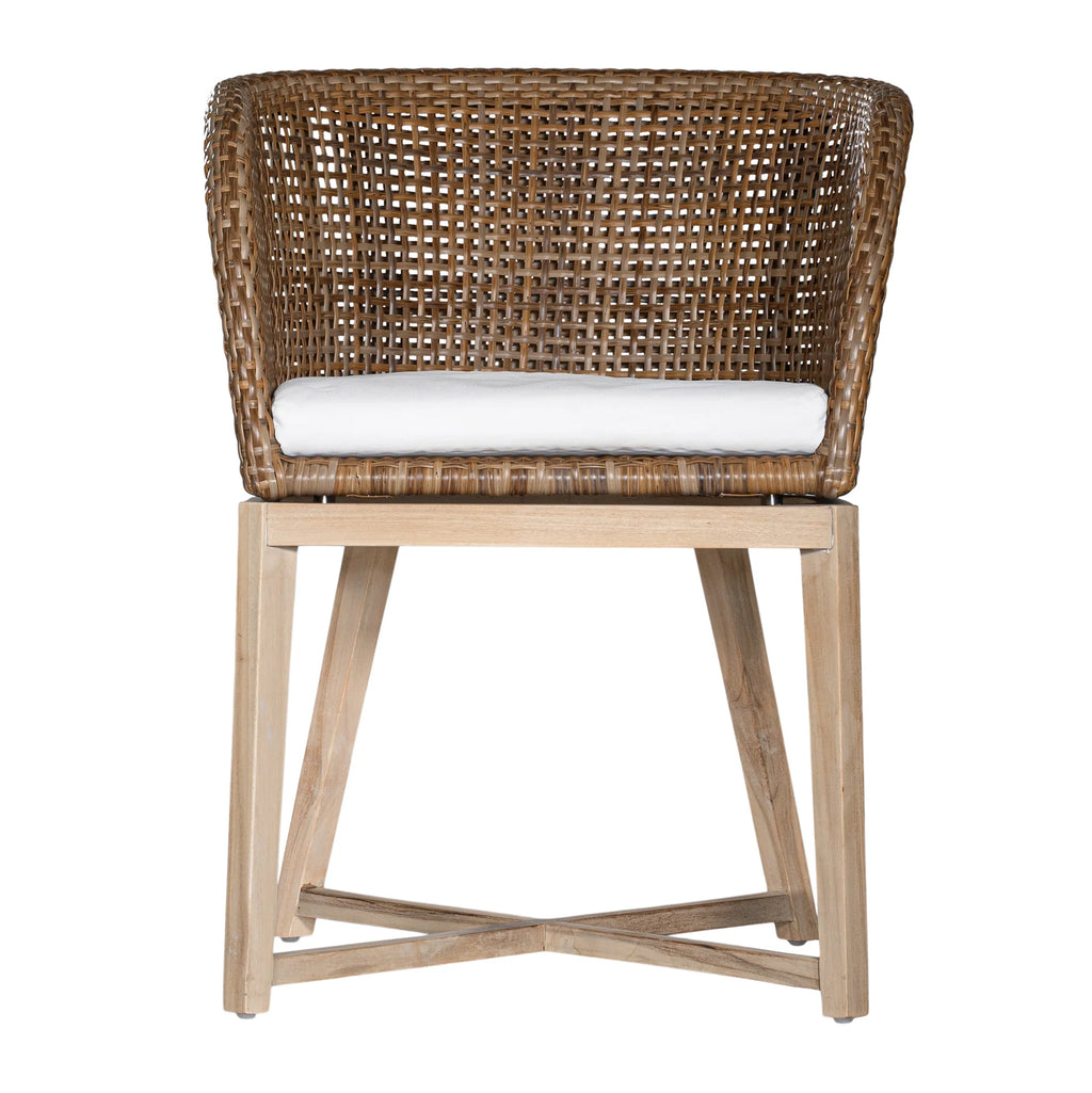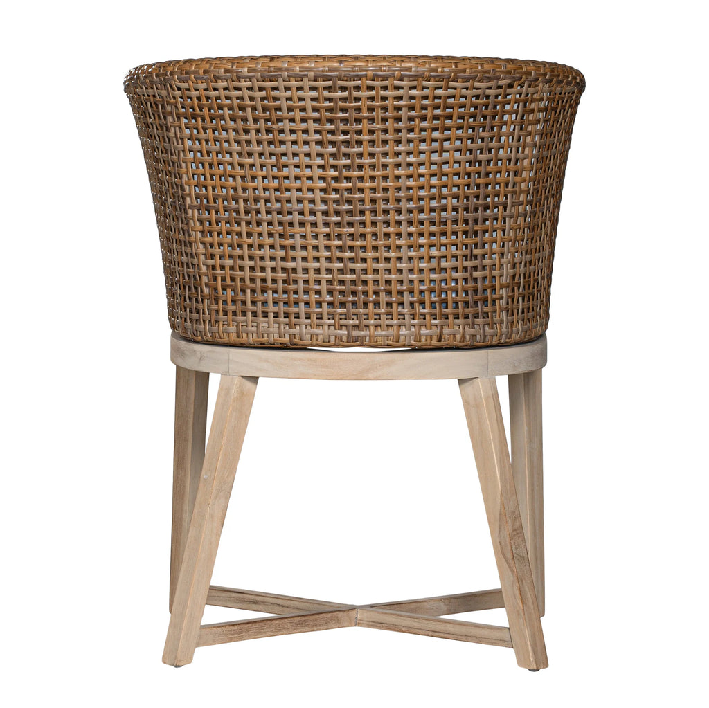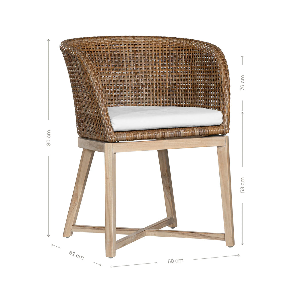 Crafted with a lightweight aluminium frame and teak legs, this chair is designed to be both durable and stylish. The seat features a beautiful web-patterned polyrattan weave, adding a touch of organic charm while ensuring durability. The cushion cover is made from outdoor-suitable fabric and is removable for easy cleaning, though we recommend professional cleaning to maintain its quality.