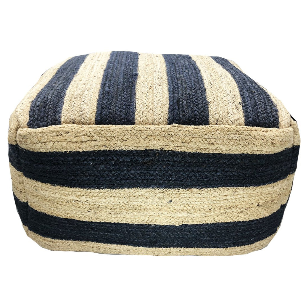 The Porta Ottoman comes handwoven in a wool & jute mix and is finished in navy blue and natural plait in a bold stripe pattern.