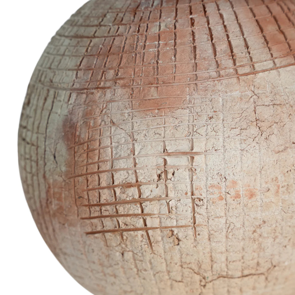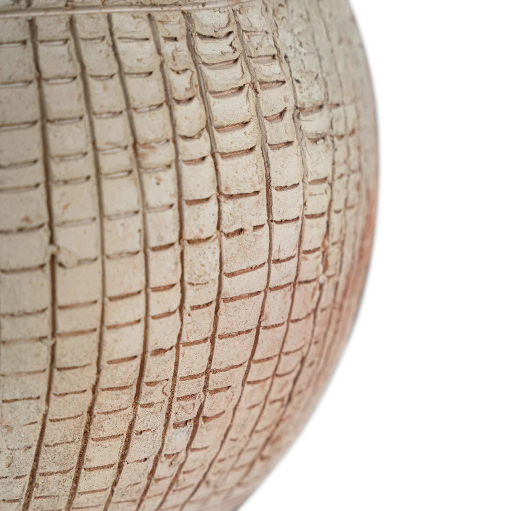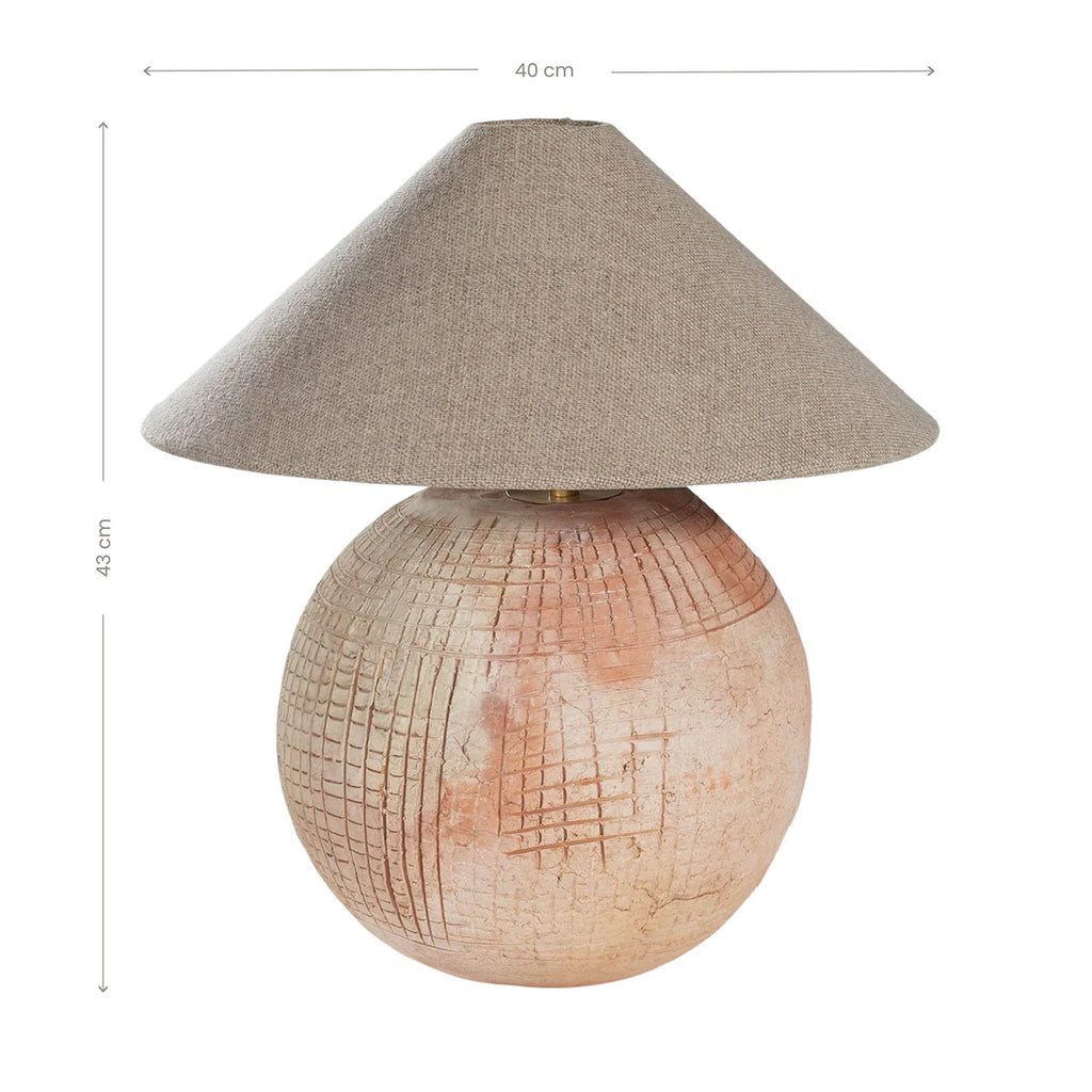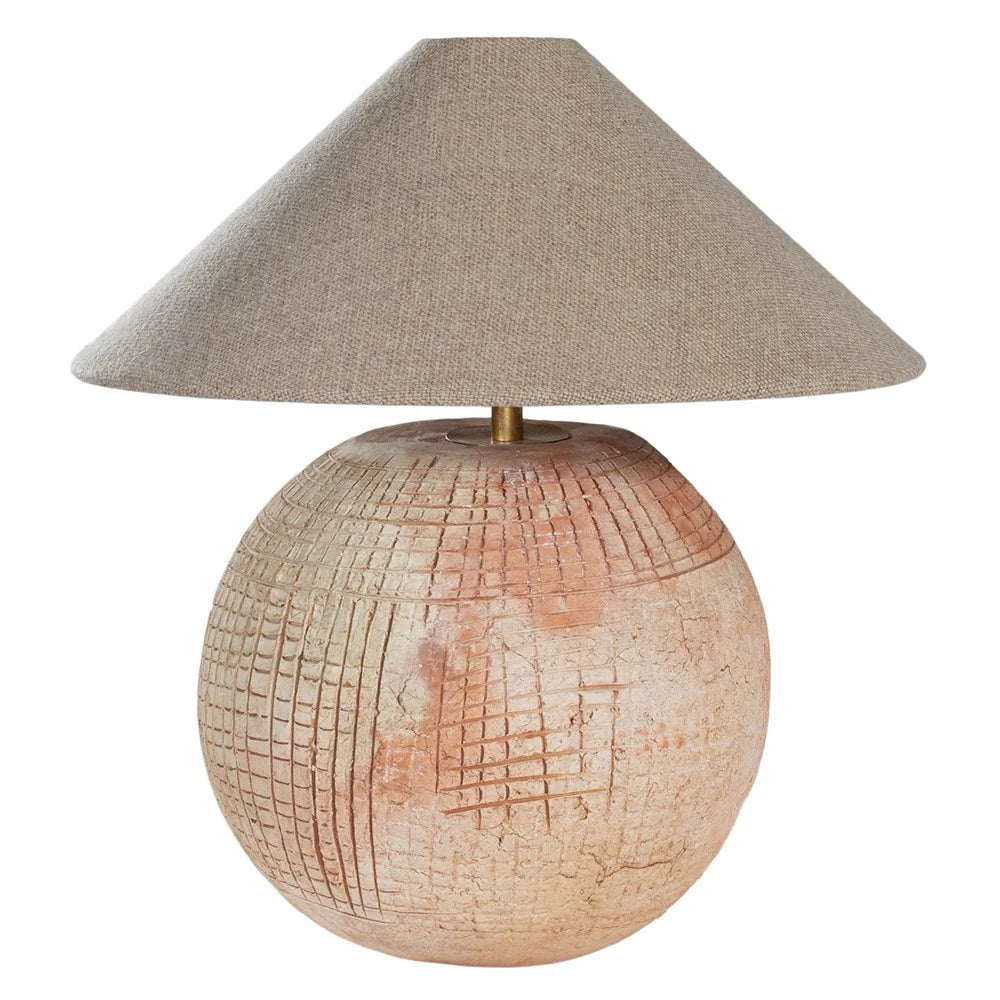 The lamp features a beautifully crafted clay base with intricate textural details, paired with a small pyramid-shaped linen shade in a warm oatmeal hue. This combination brings a natural, earthy aesthetic to your space while providing soft, ambient lighting.