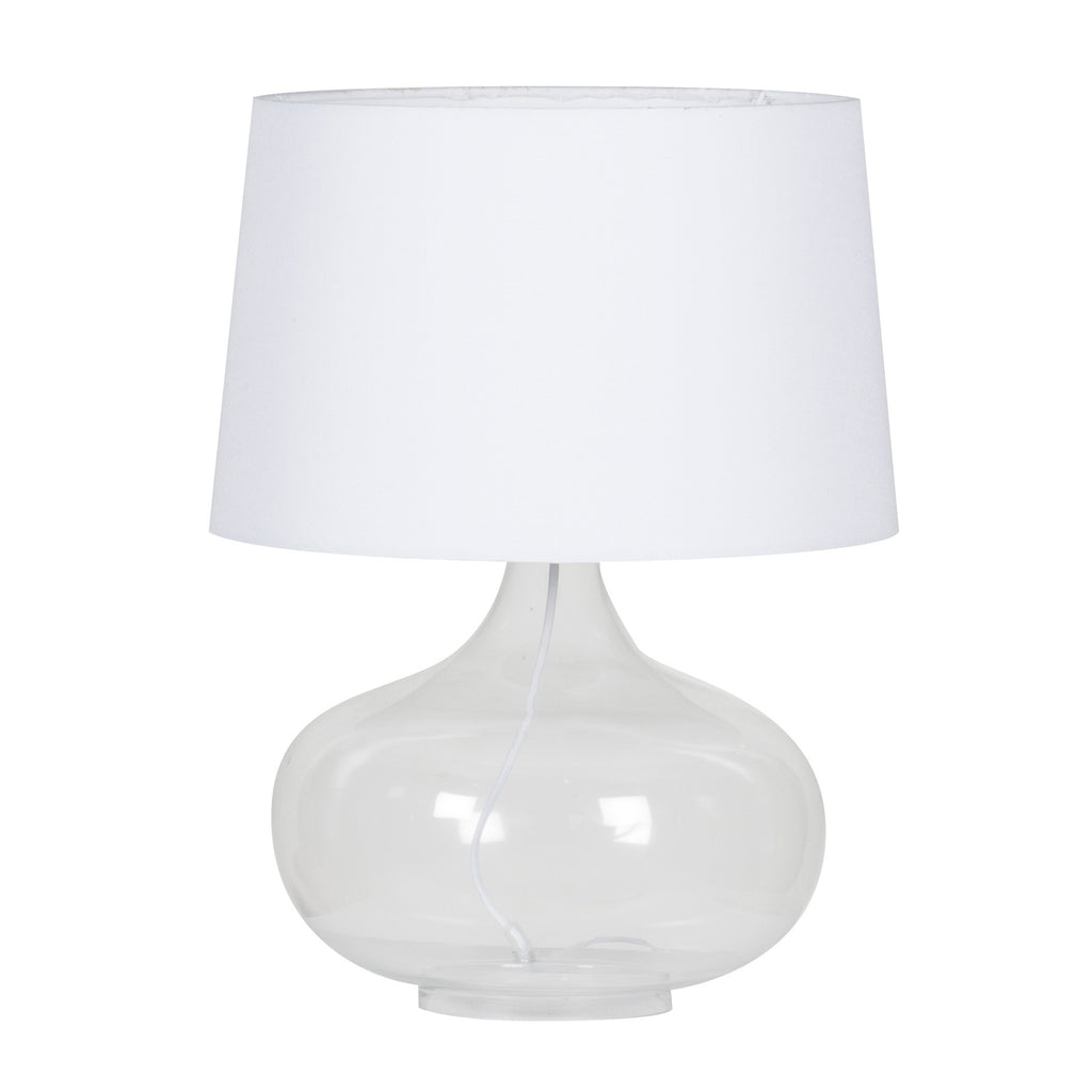 Its rounded shape and transparent glass base gives an airy feel. It comes with a white empire shade.