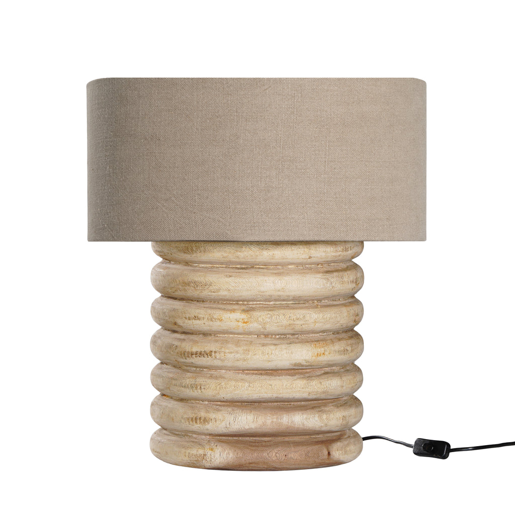 A circular ribbed base and a cylindrical linen shade create a beautiful, earthy, airy table lamp