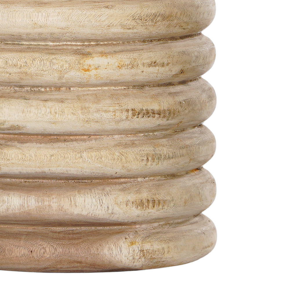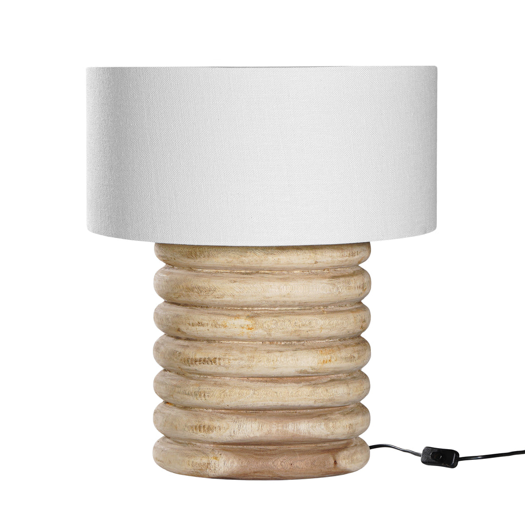 A circular ribbed base and a cylindrical linen shade create a beautiful, earthy, airy table lamp