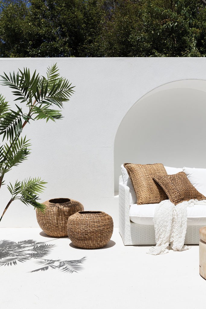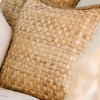 A decorative cushion filled with dacron, featuring a stunning cover woven from water hyacinth - an eco-friendly, textural material.