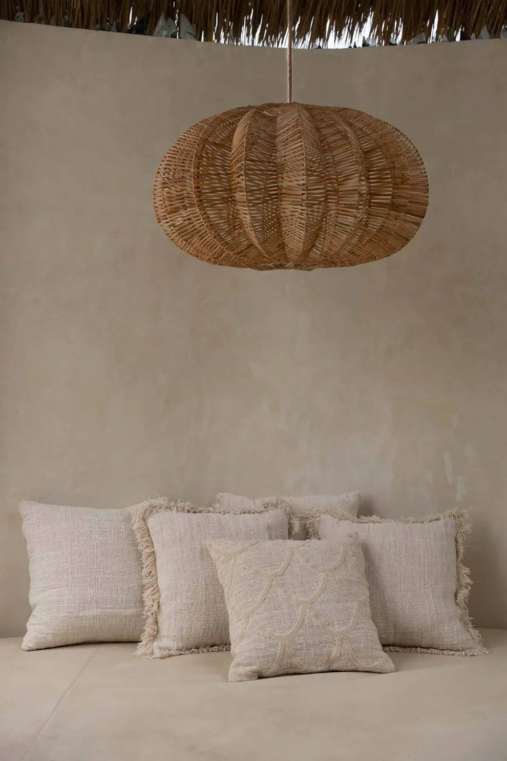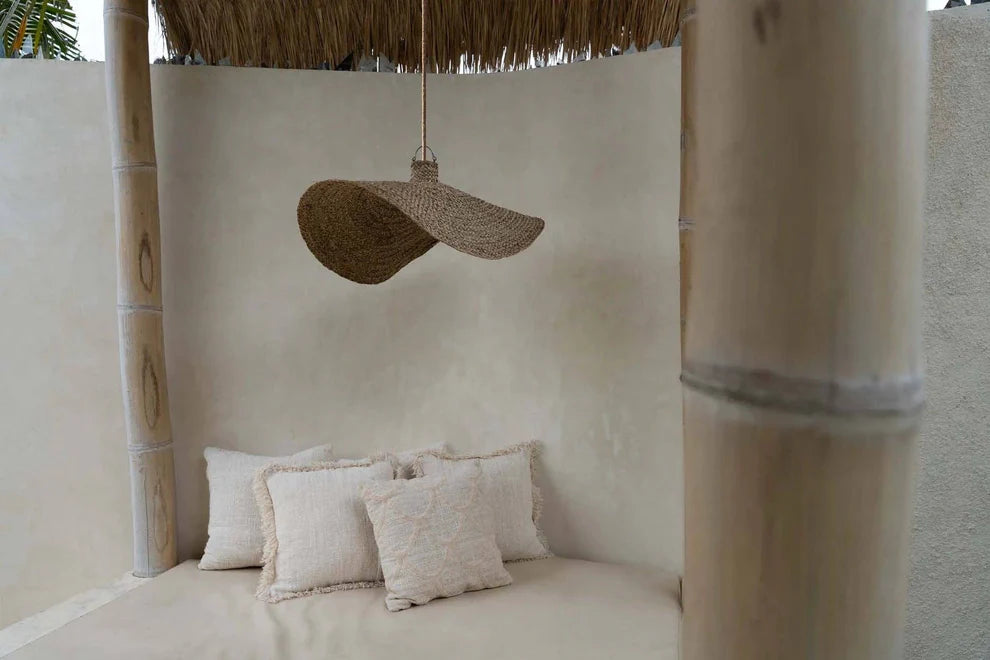 You are invited on a faraway journey to the dancing islands, ancient traditions and heavenly beaches of Indonesia. This stunning piece was inspired by a passion for travel, and was handcrafted with love from eco-friendly materials such as water hyacinth, banana leaves, rattan, grass and bamboo.