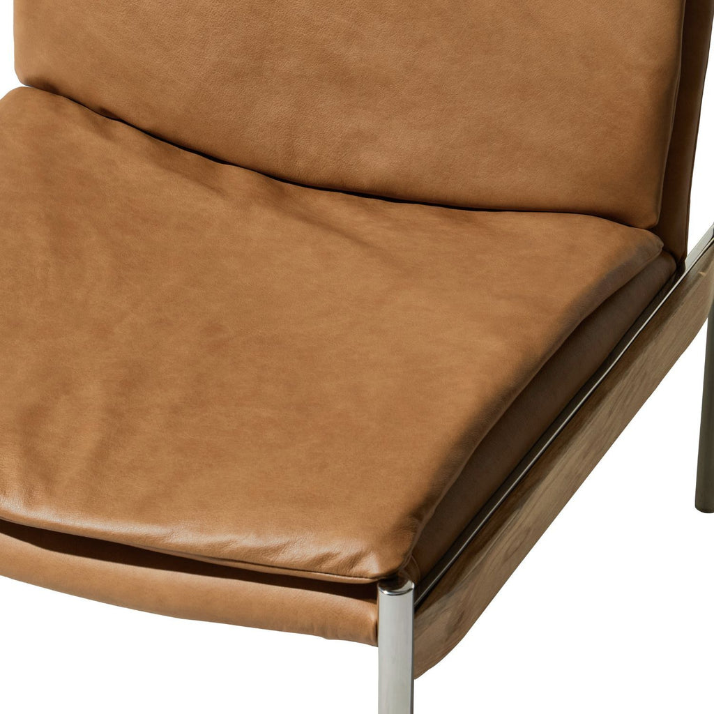 The combination of a polished stainless steel frame and ashwood accents creates a sleek, contemporary look with a touch of warmth. Crafted with high-quality materials, including sturdy stainless steel and solid ashwood, ensuring long-lasting strength and stability. The generously padded seat and backrest, upholstered in premium leather, provide exceptional comfort for extended lounging.