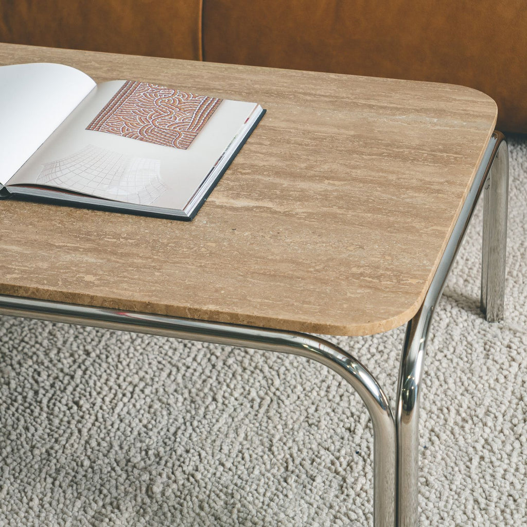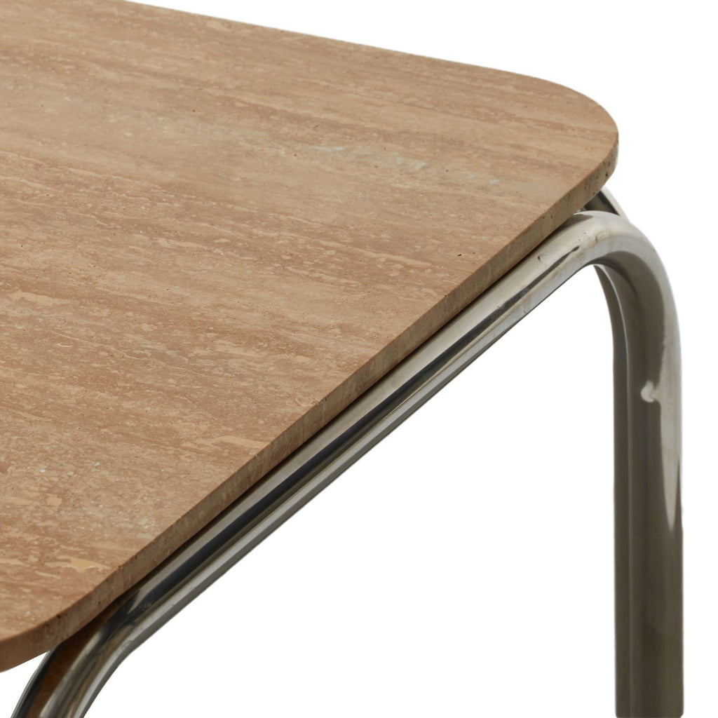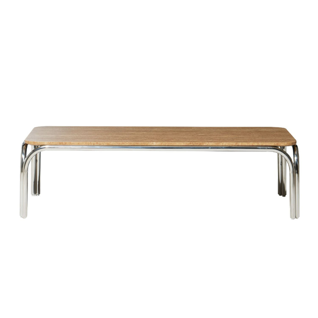 It's rectangular form is softened by gentle, curved edges, creating a refined silhouette that tempers the contrast between stone and high-shine metal. Whether styled in a chic urban loft, an upscale commercial setting, or a thoughtfully curated home, its fusion of organic texture and architectural precision adds undeniable presence, a sculptural moment, designed for those who seek character, craftsmanship, and quiet luxury in their interiors.