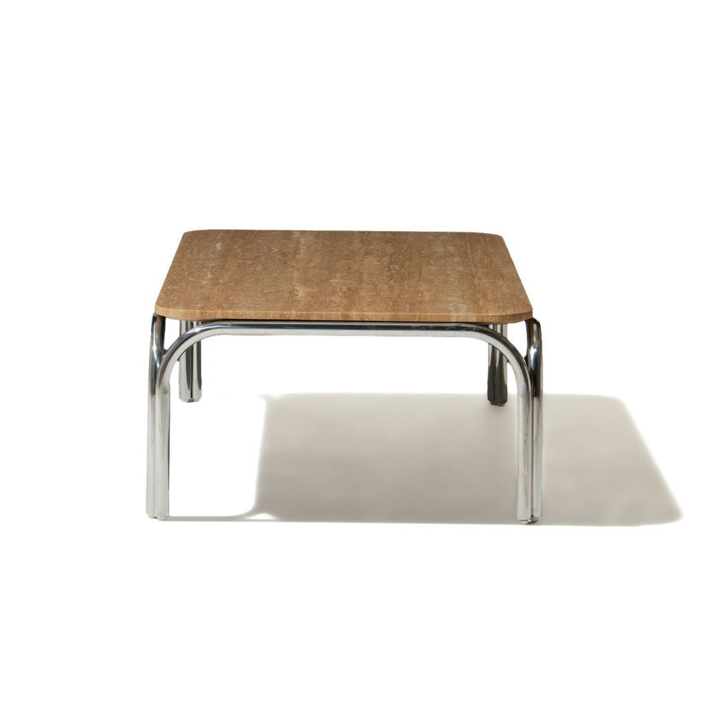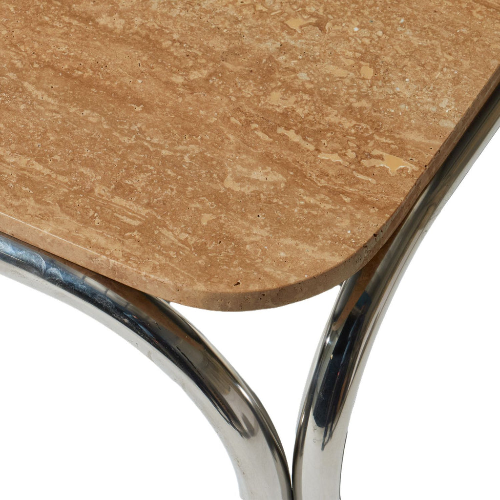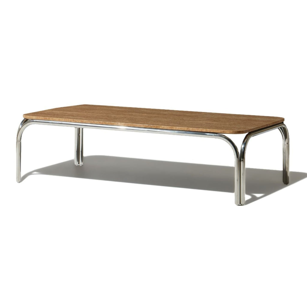 It's rectangular form is softened by gentle, curved edges, creating a refined silhouette that tempers the contrast between stone and high-shine metal. Whether styled in a chic urban loft, an upscale commercial setting, or a thoughtfully curated home, its fusion of organic texture and architectural precision adds undeniable presence, a sculptural moment, designed for those who seek character, craftsmanship, and quiet luxury in their interiors.