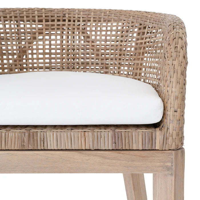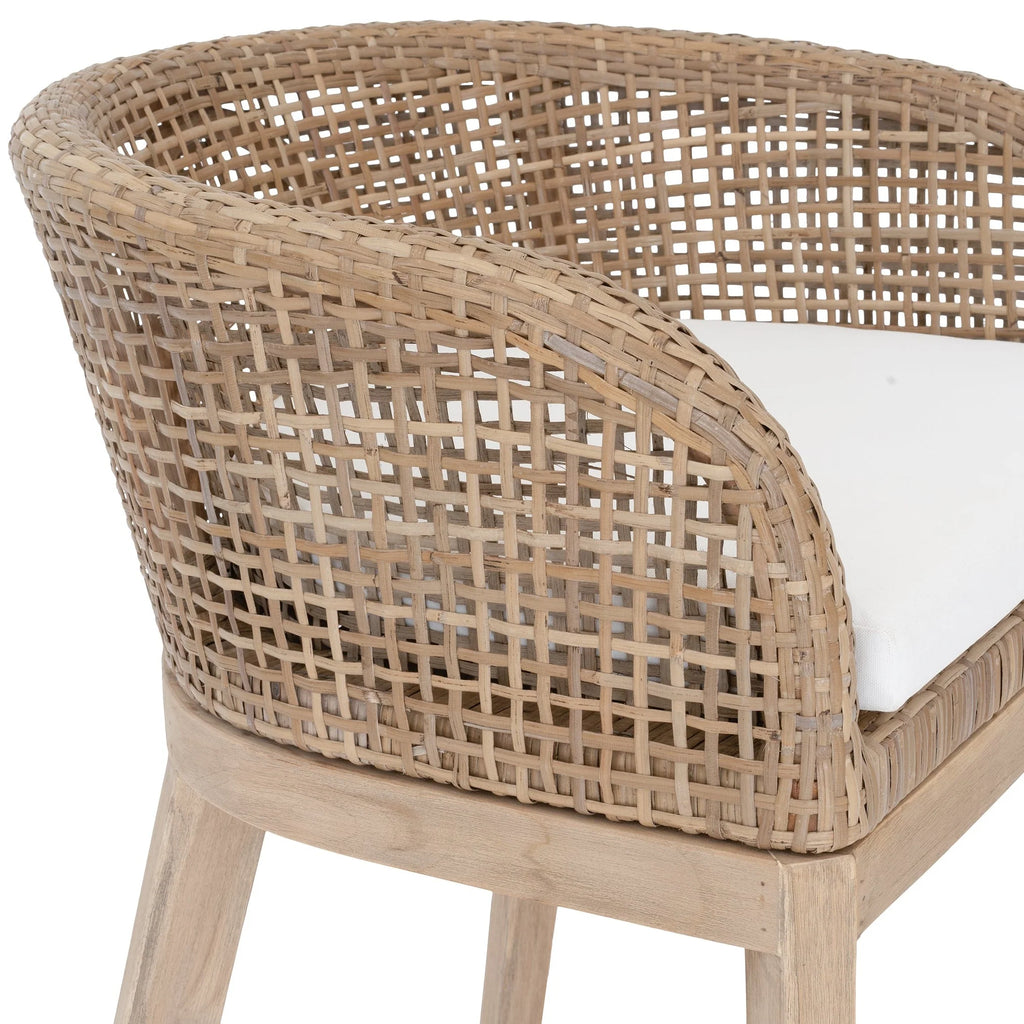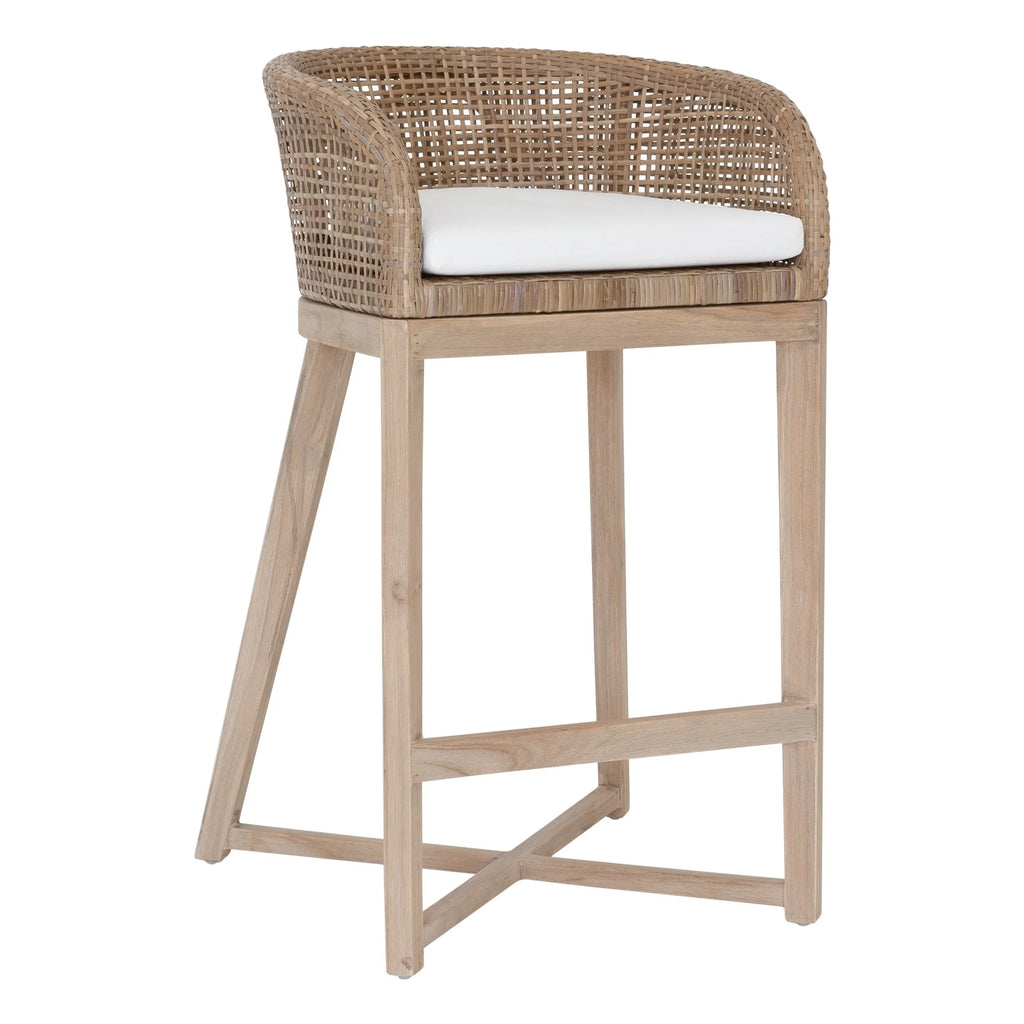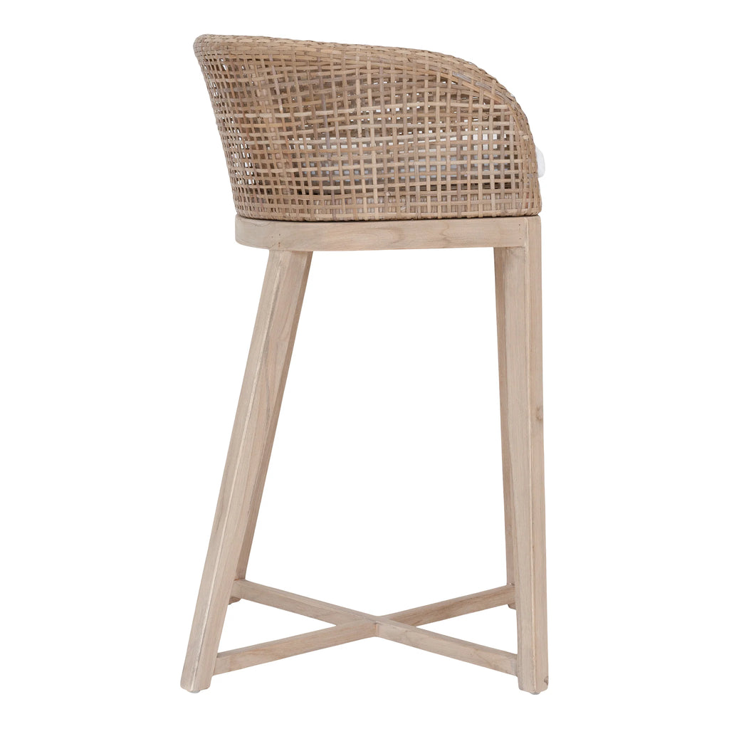 The Tula Barchair has a lightweight aluminium frame, teak legs in reclaimed age finish and web patterned polyrattan seat.