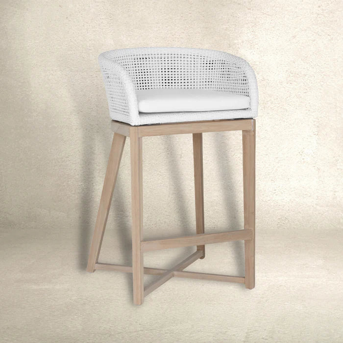 The Tula Barchair has a lightweight aluminium frame, teak legs in reclaimed age finish and web patterned polyrattan seat.
