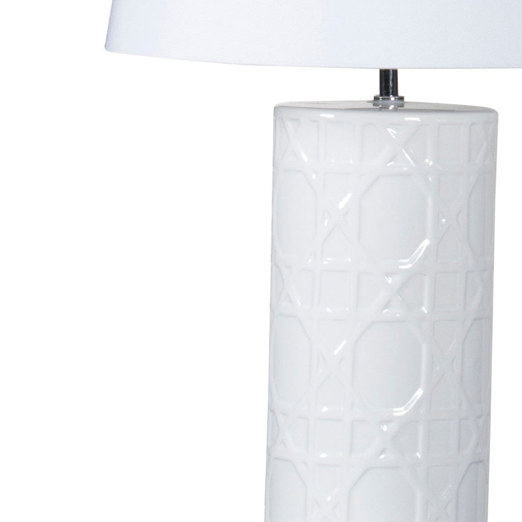 The cylindrical base features a wicker-inspired pattern. The lamp comes in a bright white and with a white cotton shade.