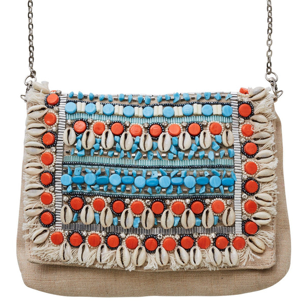 The Bohemia Gypsy Clutch has a woven Jute base that is highly embellished with geometric beading, mirrors and embroidery. The clutch is finished with beaded tassels on all edges and has a chain that can be easily removed.