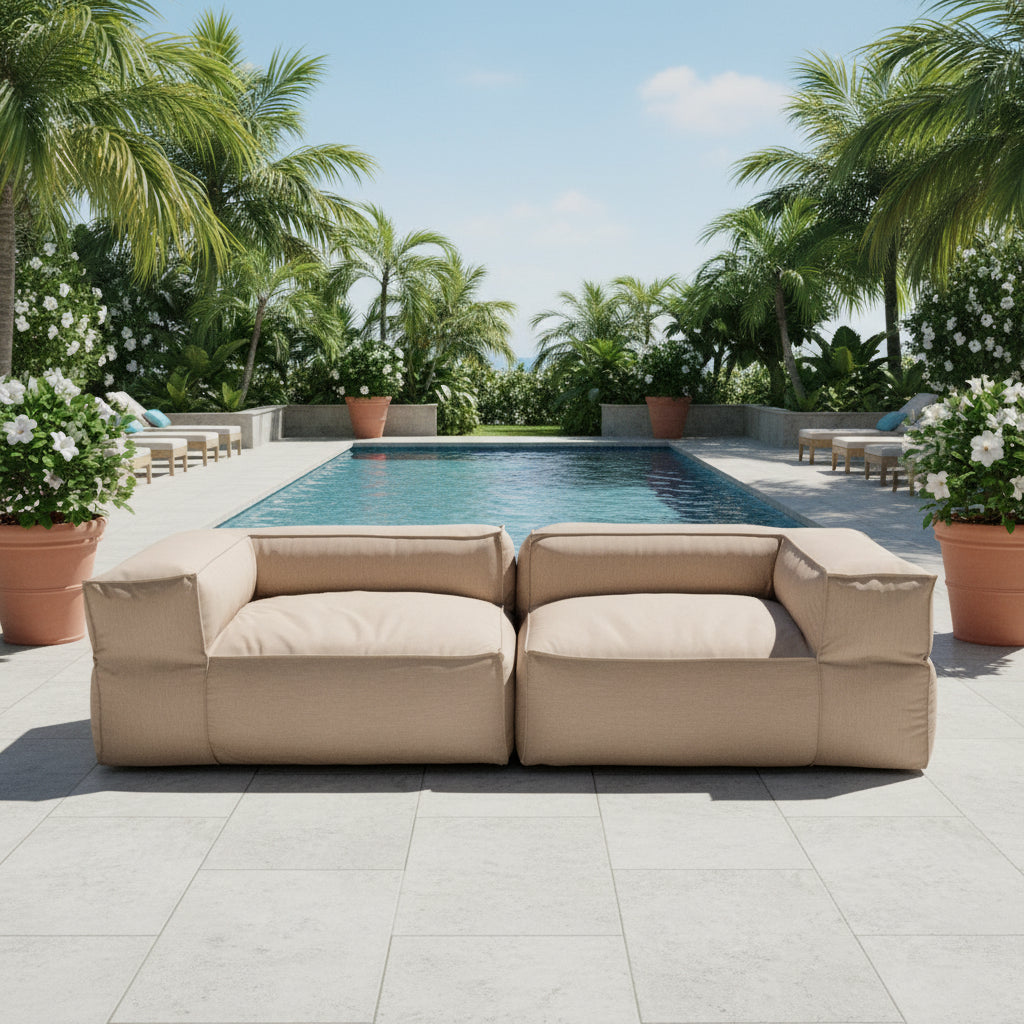 The Meelah patio bean-bag loveseat combines sumptuous comfort with the textured weave of weather-resistant Sunbrella Cast fabric.
