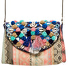 The Bohemia Collective Clutch features an aztec-inspired base fabric and a highly embellished top flap of pom poms, beading, shells and sequins. The clutch also has a metal chain.
