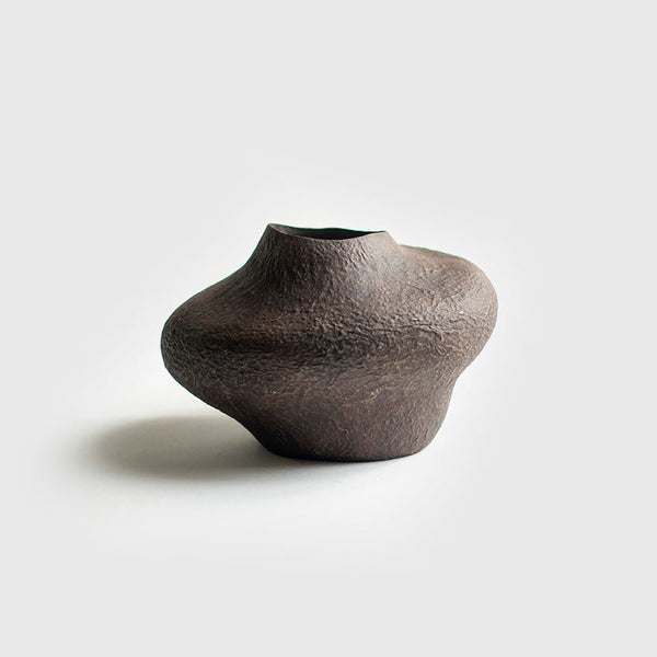 Sculptural vase handcrafted from paper pulp in black ocher colour.