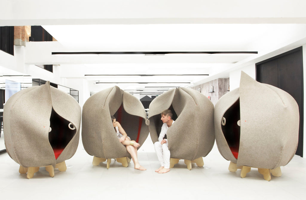 HUSH is an award-winning designer seating pod handcrafted in the UK entirely from biodegradable felt and recycled wood, which users can crawl into to work or rest in a wonderful private cocoon