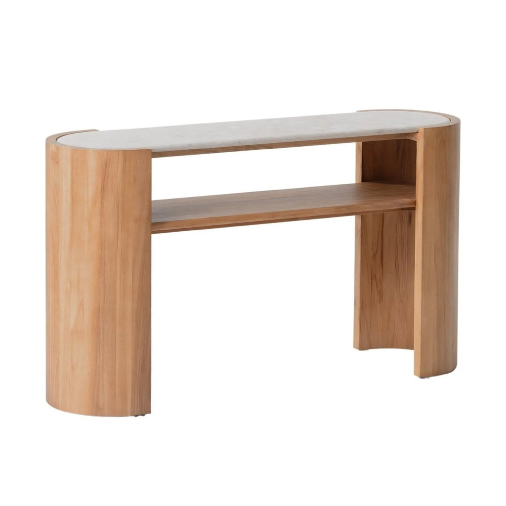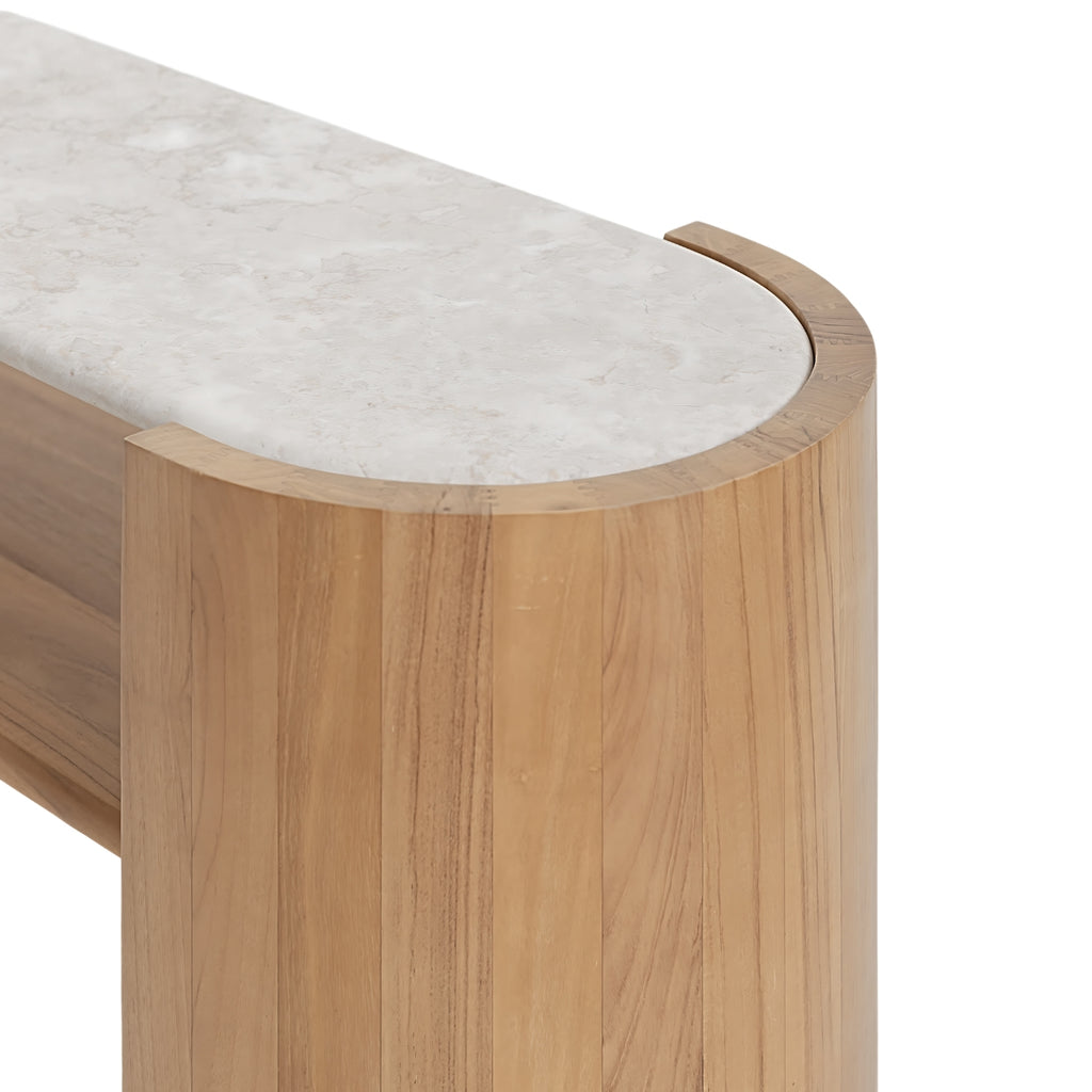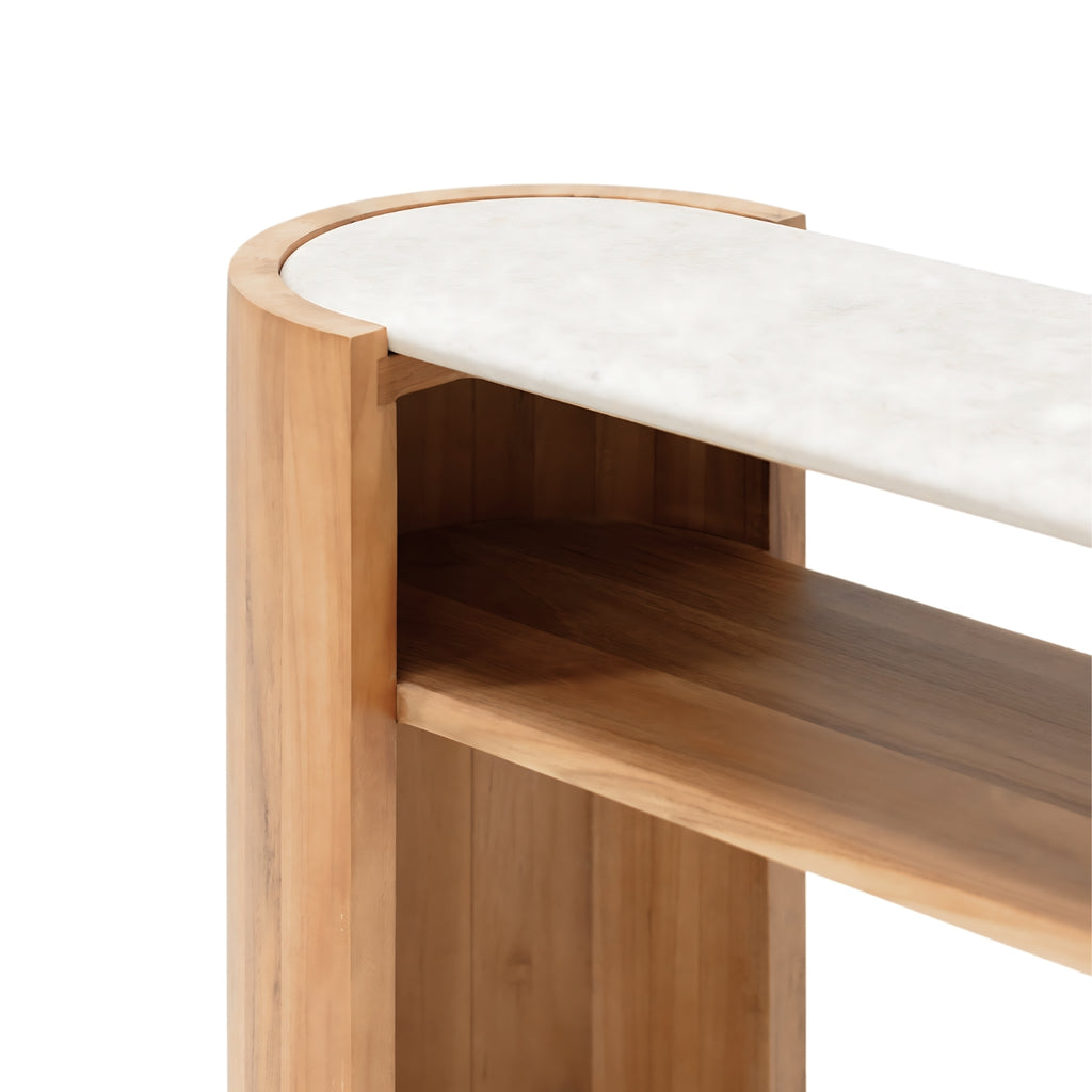 Crafted from a luxurious marble top and a teak base, the Isak console boasts a sleek, streamlined design with a graceful curved profile.