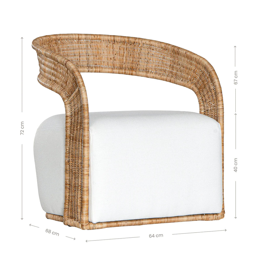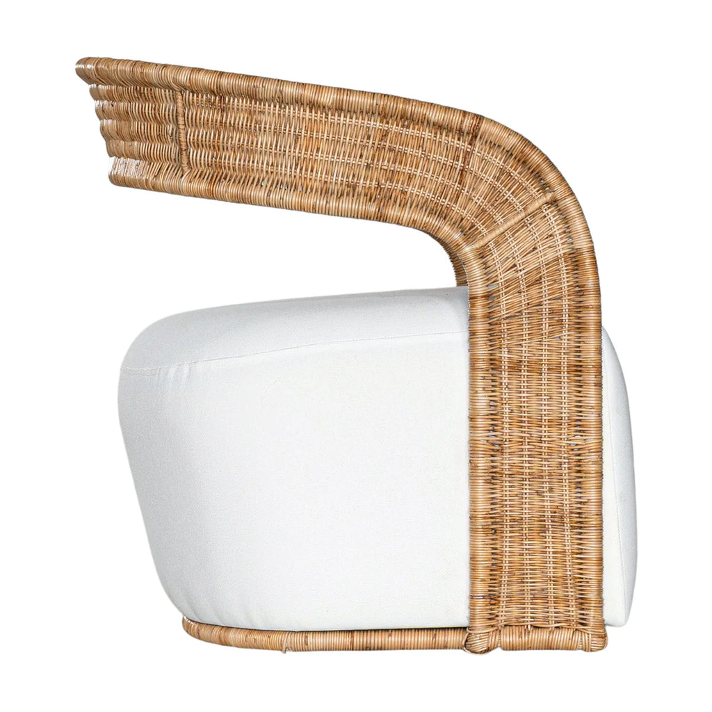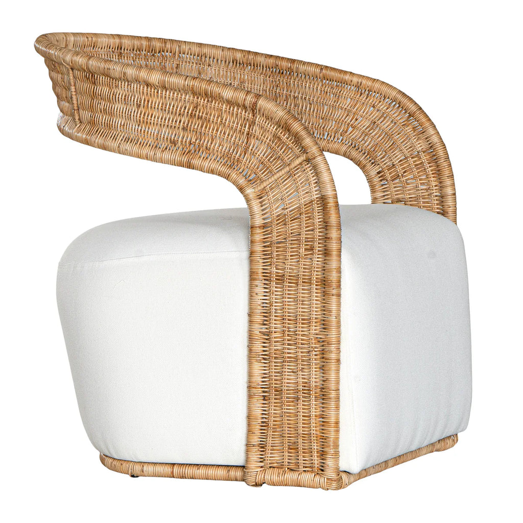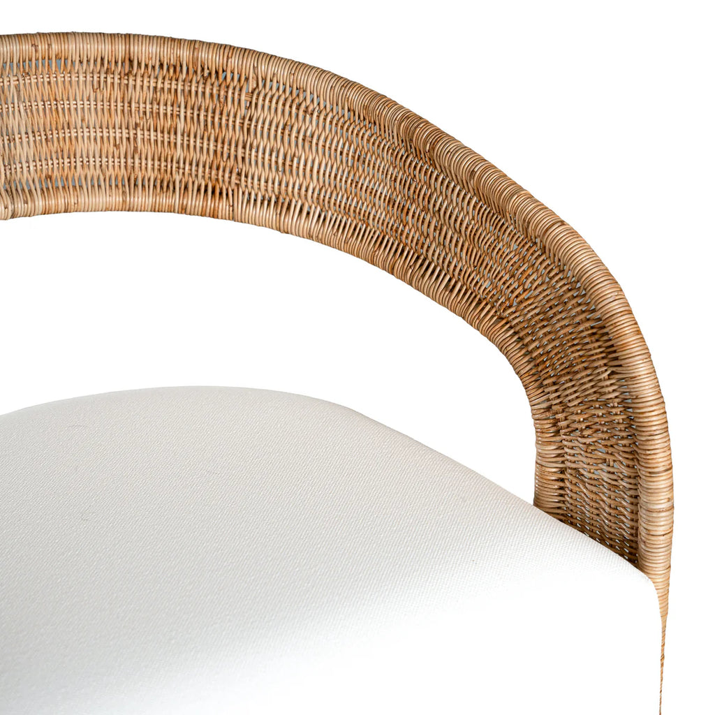 Expertly crafted, this chair features a gracefully curved design and a frame covered in handwoven natural rattan, creating a timeless and elegant look.