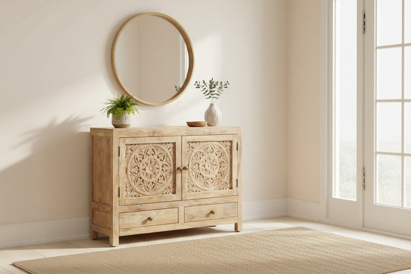 MAYAH CARVED WOOD STORAGE CABINET | 2-DOOR +2-DRAWER | WHITEWASH