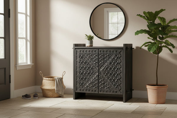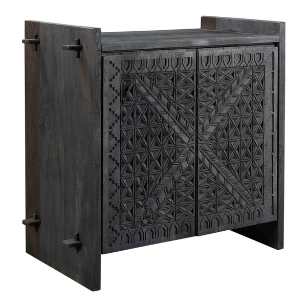RAQUEL CARVED WOOD STORAGE CABINET | 2-DOOR | RECLAIMED ACACIA | DARK GRAY