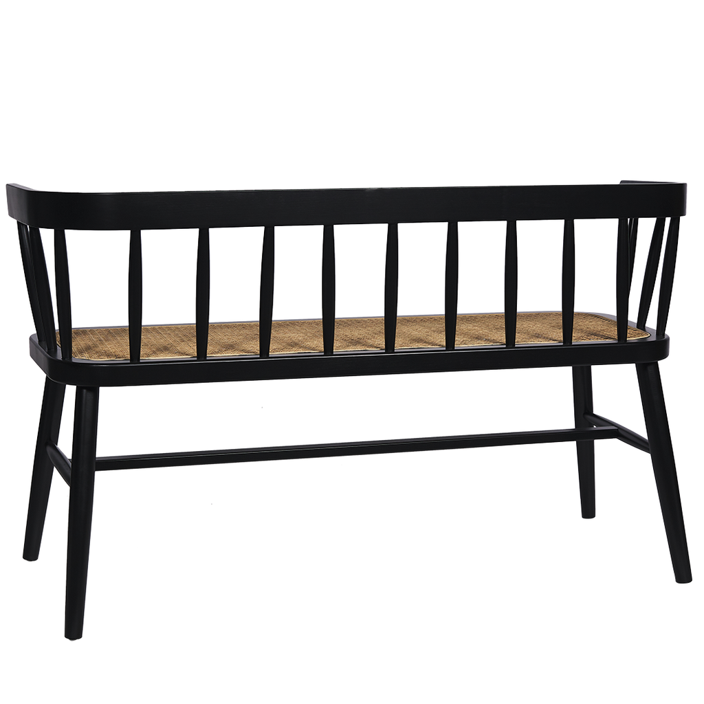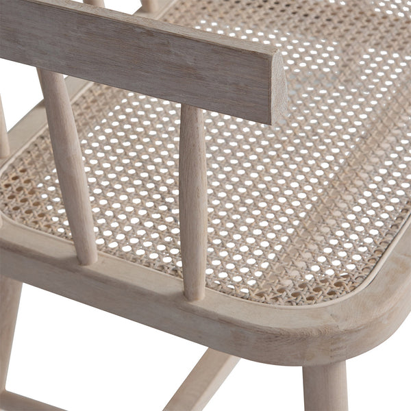 Crafted from natural timber with a whitewash finish, the Selby Bench Seat is a classic shape featuring a woven rattan seat and Shaker style spindled backrest.