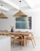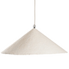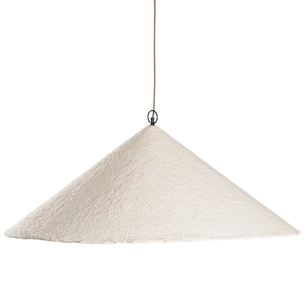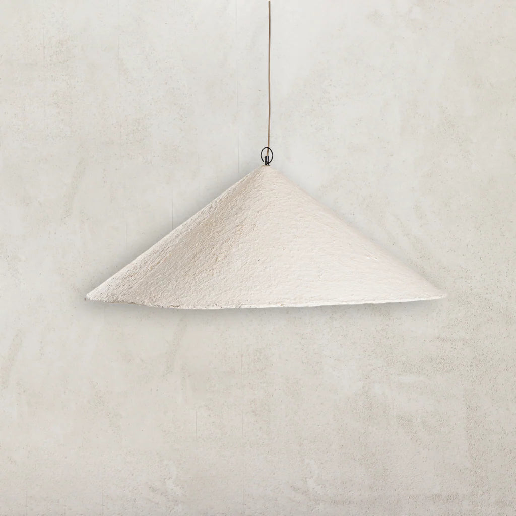 Handcrafted from papier-mâché, each pendant is entirely unique, with subtle variations in texture, natural cracks, and organic imperfections that showcase the beauty of its artisanal creation. The warm, earthy tones and bold geometric silhouette make it a perfect addition to contemporary, or rustic interiors.